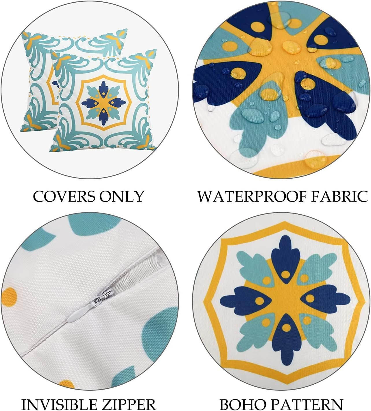 Outdoor Waterproof Throw Pillow Covers Set of 4 Floral Printed and Boho Farmhouse Outdoor Pillow Covers for Patio Funiture Garden 18×18 Inch Blue