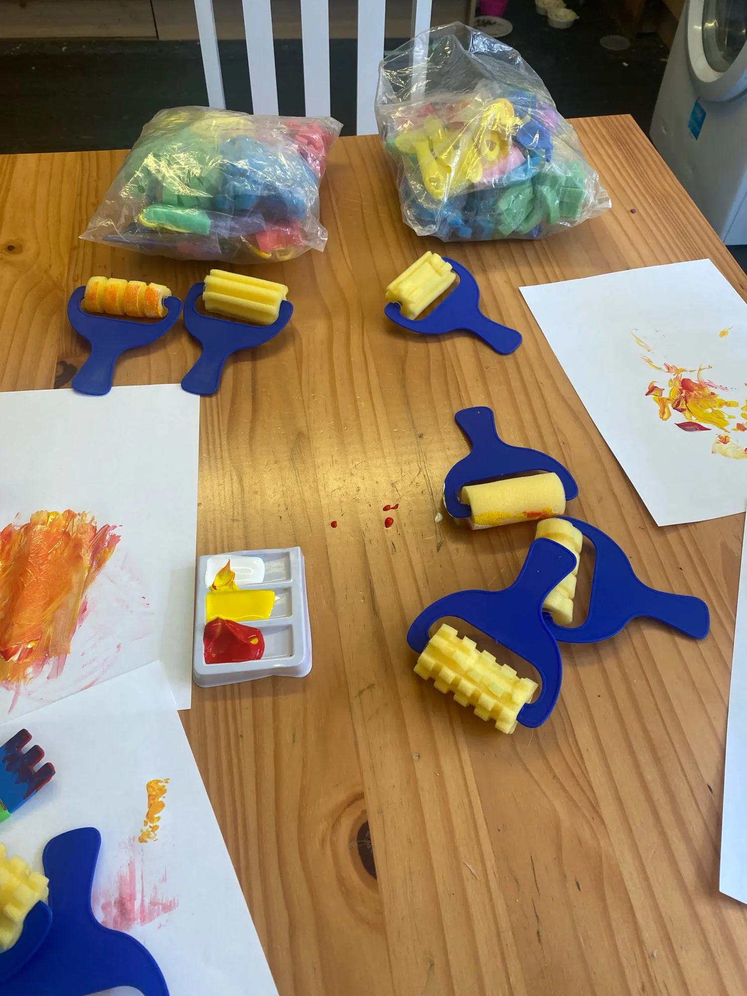 This review is for the 30 piece sponge, painting, brush kit. This kit comes with sponges of different sizes and shapes, rollers with different shapes, and brushes. This is a very nice kit that will keep kids occupied.