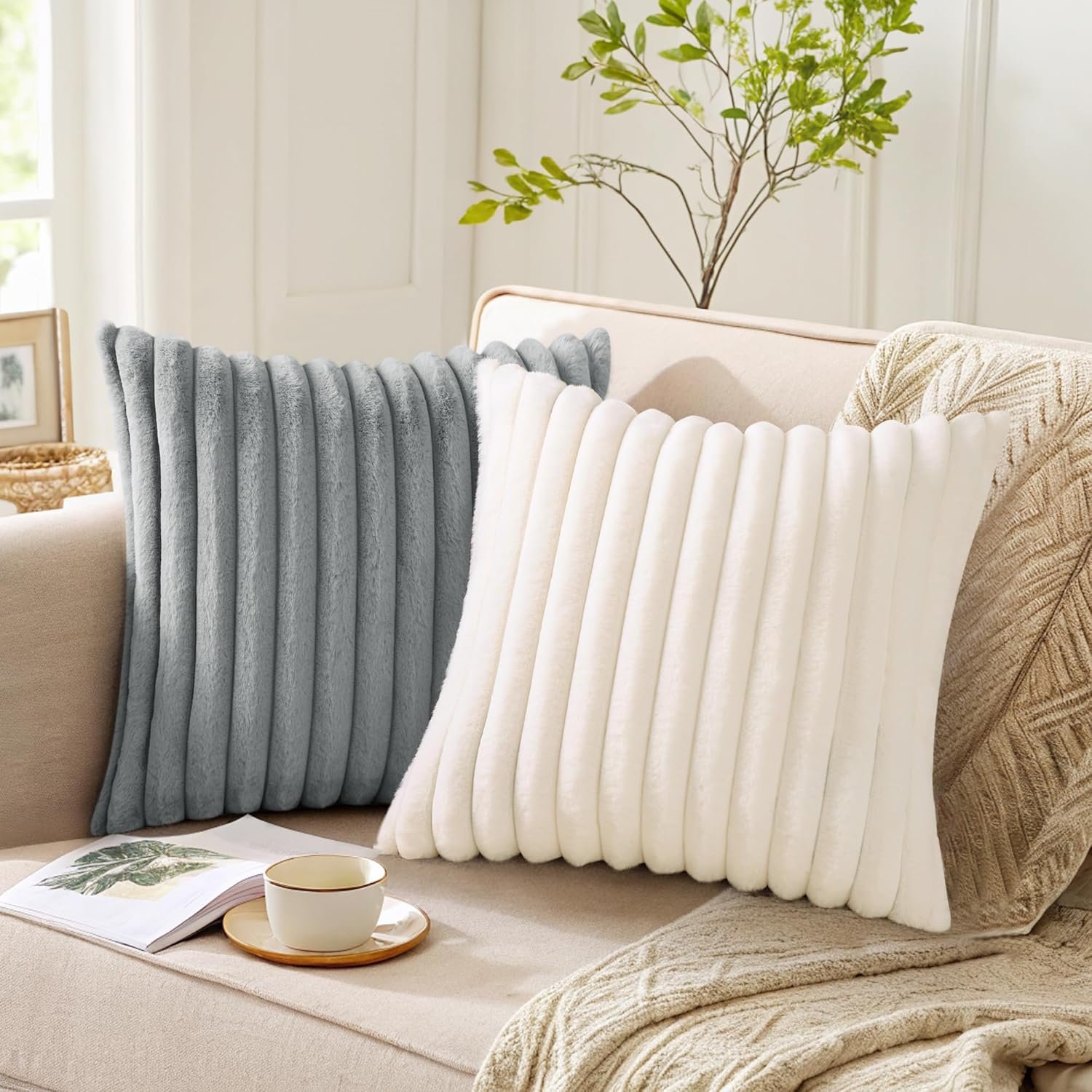 Pallene Faux Fur Plush Throw Pillow Covers 18×18 Set of 2, Luxury Soft Fluffy Striped Decorative Pillow Covers for Sofa, Couch, Living Room, Cream White