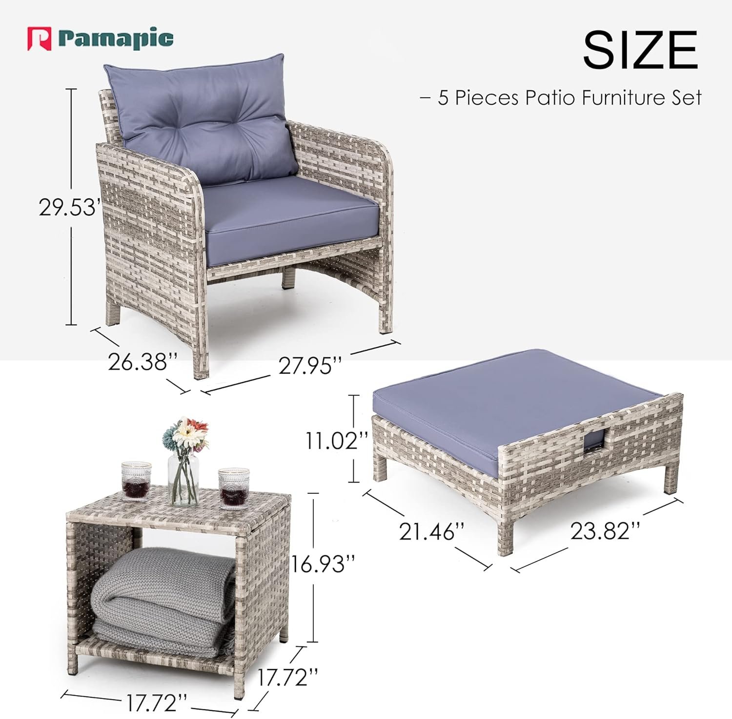 【Luxurious & Comfortable】 PAMAPIC’s 5-piece patio furniture set includes 2 single chairs, 2 ottomans and 1 coffee table. Each sofa can hold up to 330 pounds. Large ottomans provide you with a comfortable place to rest