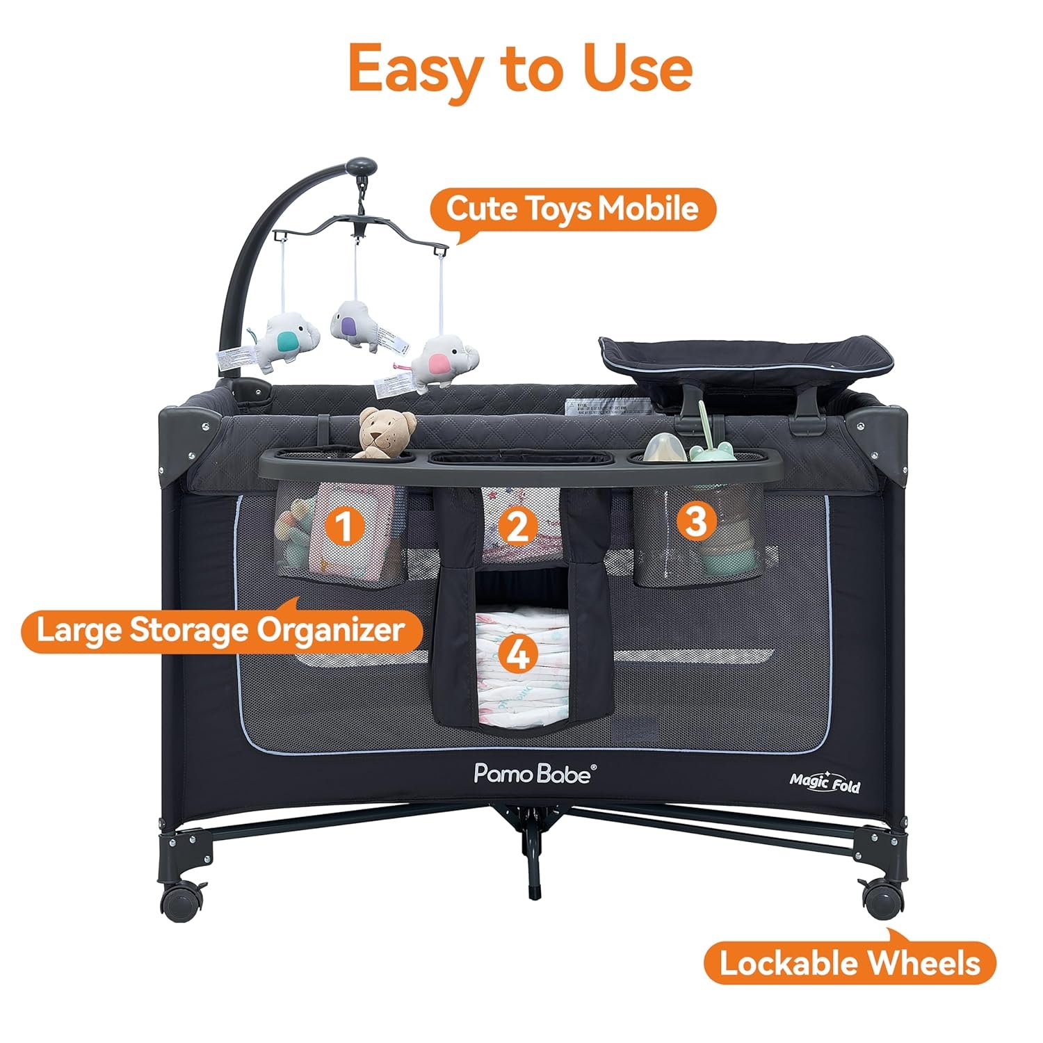 Pamo Babe 1-Second Setup 3-in-1 Playard for Babies – Heavy-Duty Steel Frame for Safe Sleep Space, Portable Crib with Zip Door & Changing Table, Locking Wheels, Breathable Mesh