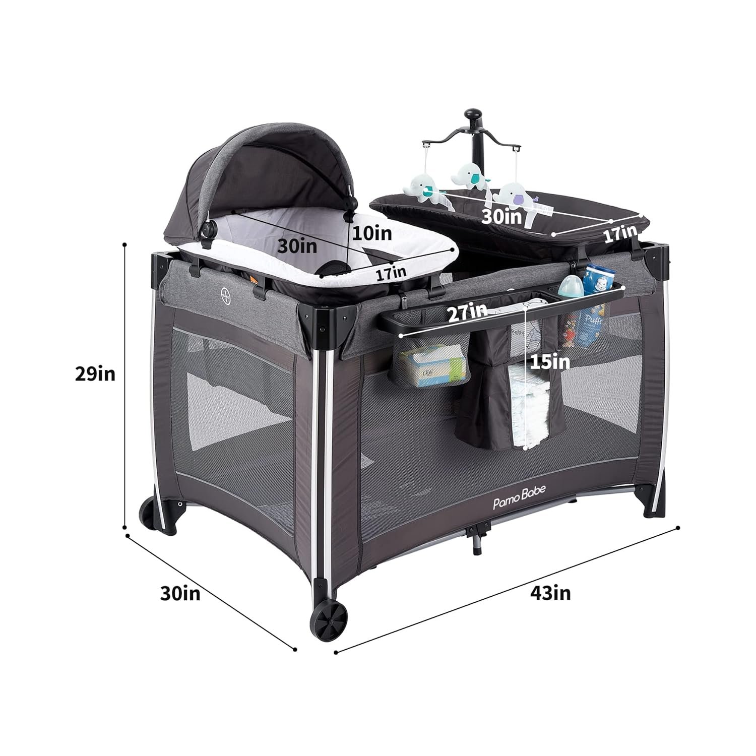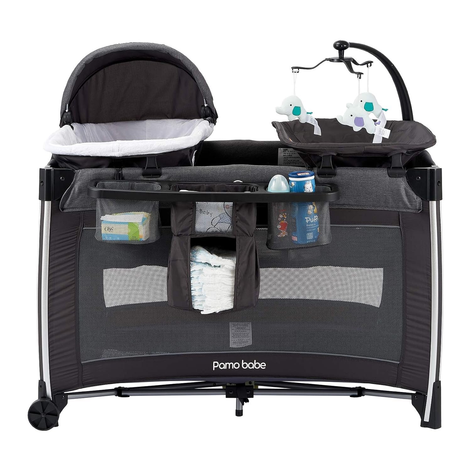 Pamo Babe 4 in 1 Portable Baby Crib Deluxe Nursery Center, Foldable Travel Playard with Bassinet, Mattress, Changing Table for Newborn, Infant, Toddler(Grey)