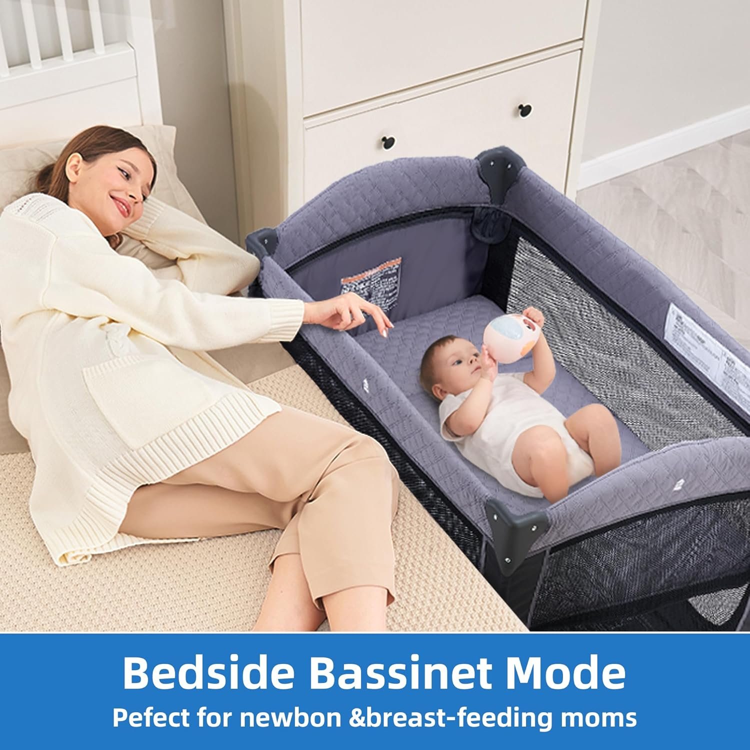 【DETACHABLE & FOLDABLE DESIGN】–The changing table, storage bag, bassinet and canopy can be easily removed from the baby playard. And the playard can be quickly folded up without extra tools. The handbag helps you store the folded crib and take the crib out for travel.
