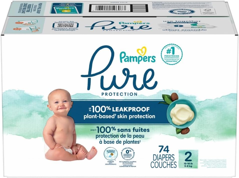 Pampers Baby Diapers – Pure Protection – Size 2, 74 Count, for up to 100% Leakproof, Premium Plant-based Skin Protection