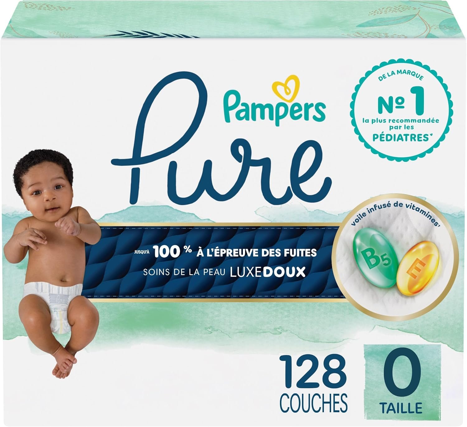 Pampers Pure Protection Baby Diapers, Size 0 (10 lbs ), 128 Count, Up to 100% Leakproof, Premium Plant-based Skin Protection, Hypoallergenic Soft Diapers