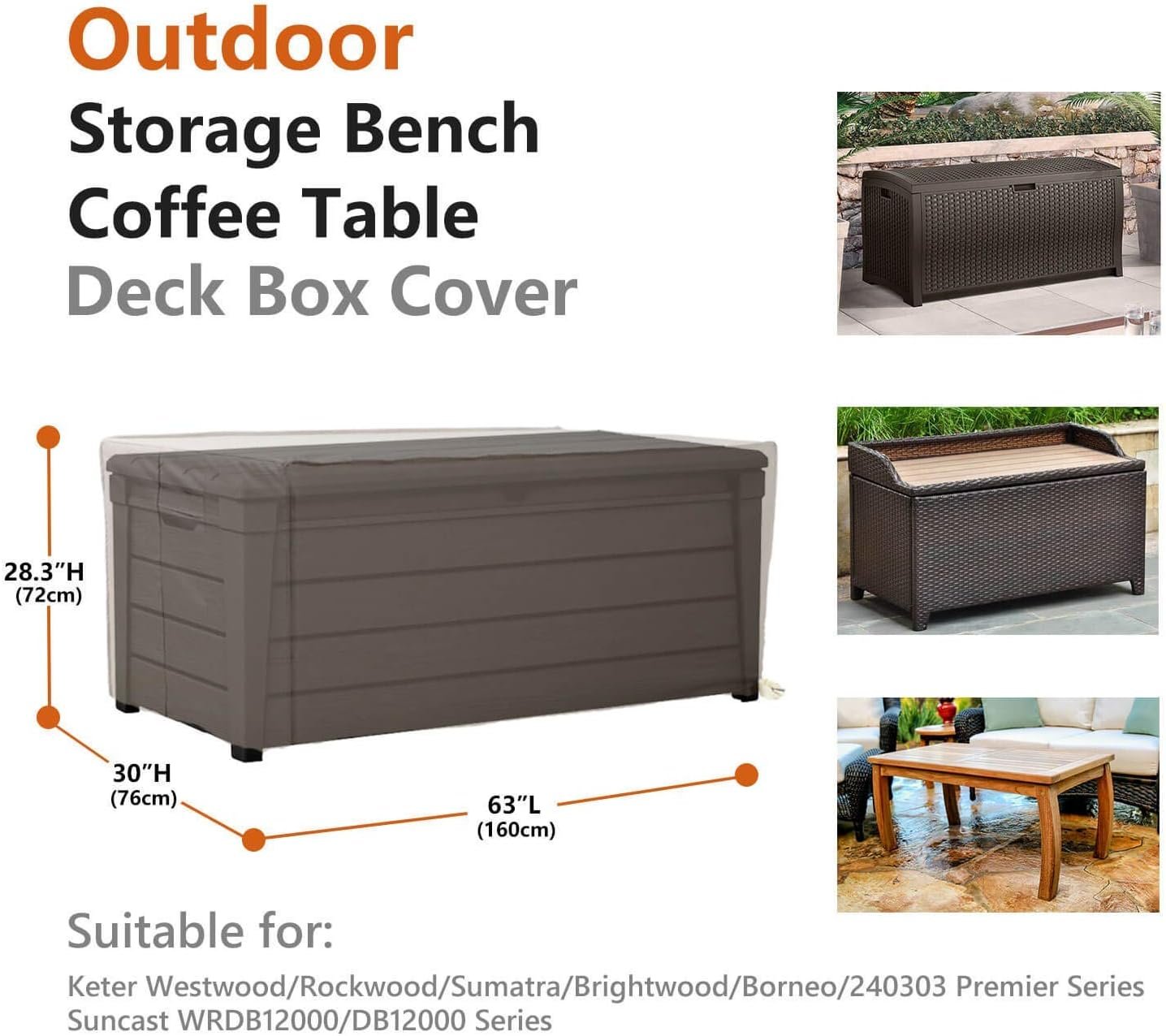 Patio Ottoman Cover —- Universal Size —- 63” (L) 30” (D) 28.3” (H), Suitable for Keter Westwood/Rockwood/Sumatra/Brightwood/Borneo/240303 Premier Storage Bin, Suncast WRDB12000/DB12000 Plastic Container Bin (From 120 – 150 Gallon)