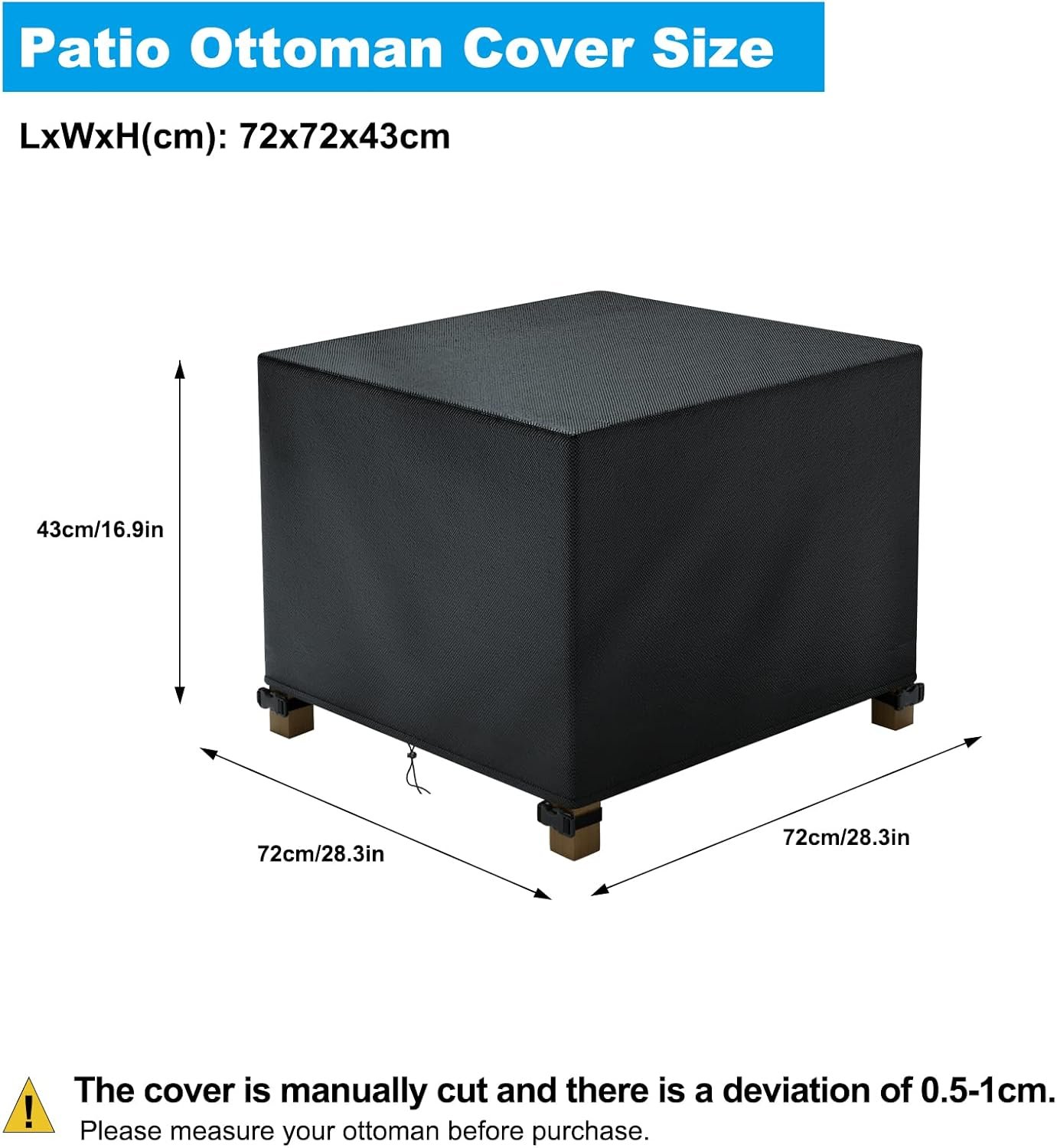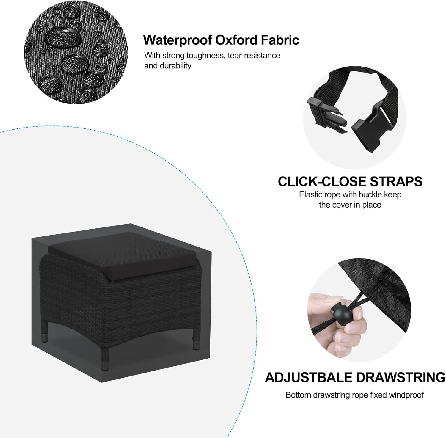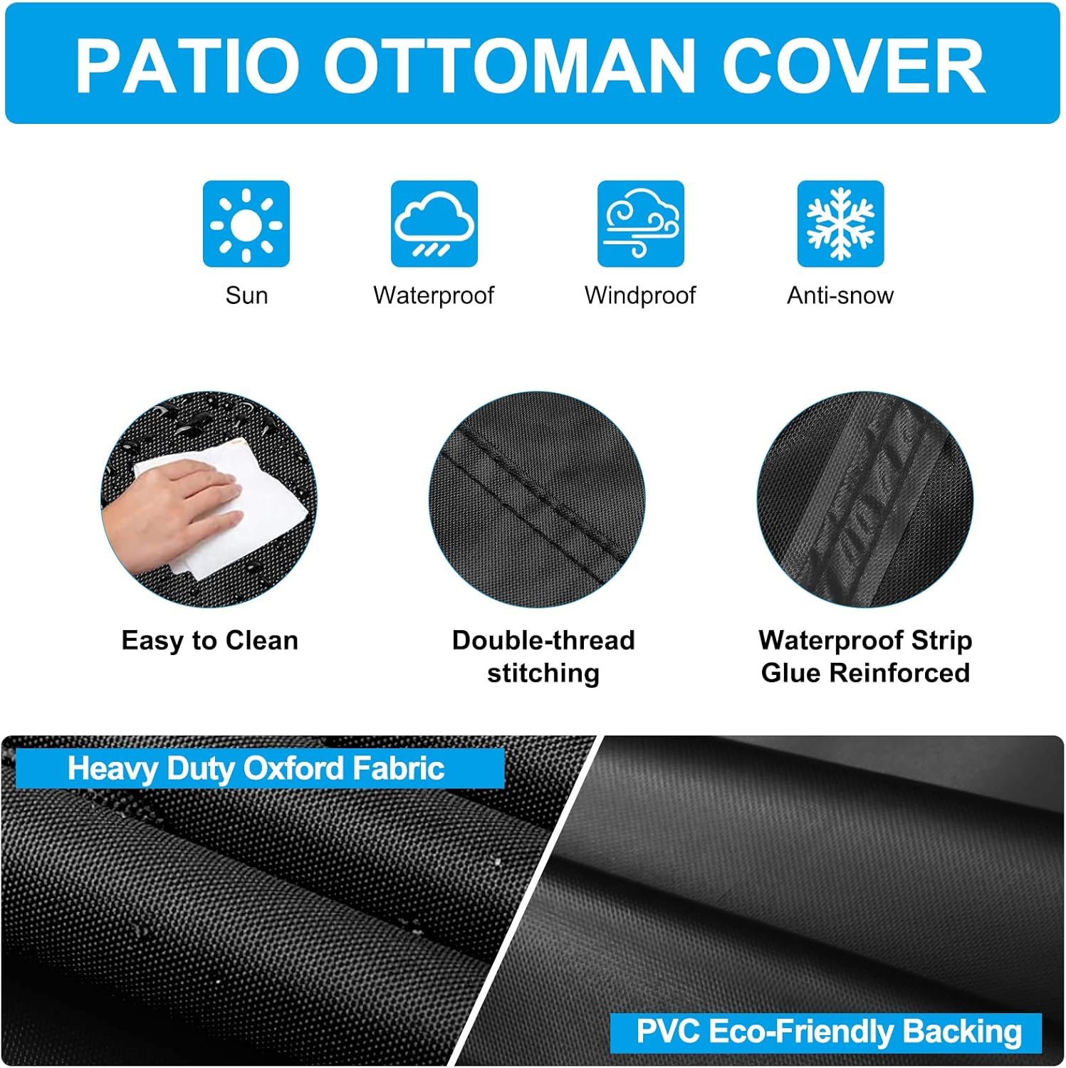 Waterproof Oxford Fabric – Patio ottoman cover made of durable oxford fabric with waterproof surface coating and exquisite stiching at seam.Strong durability to ensure uneasy to rip and fade.Worry free of your patio ottoman being affected by outdoor elements like sun, dust, rain, snow, etc