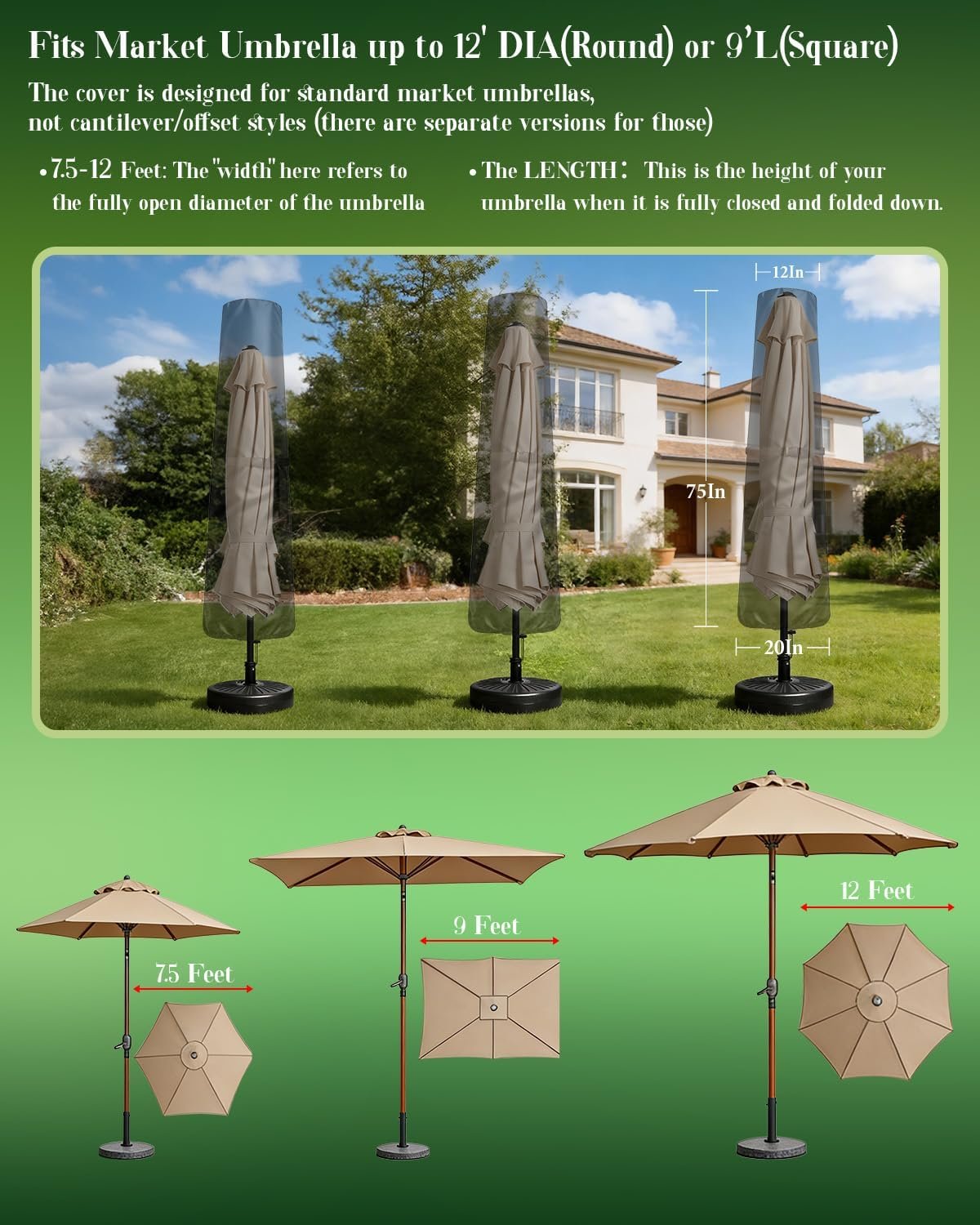 PATIO UMBRELLA COVER PERFECT FIT standard Market Umbrellas up to 12′ DIA(Round) or 9’L(Square). 9-12 feet: The “width” here refers to the fully open diameter of the umbrella. Perfect Match: Standard center-pole umbrellas commonly used on patios and decks, Market-style umbrellas with traditional center post design, Pool umbrellas and Table umbrellas that mount through outdoor dining table centers.