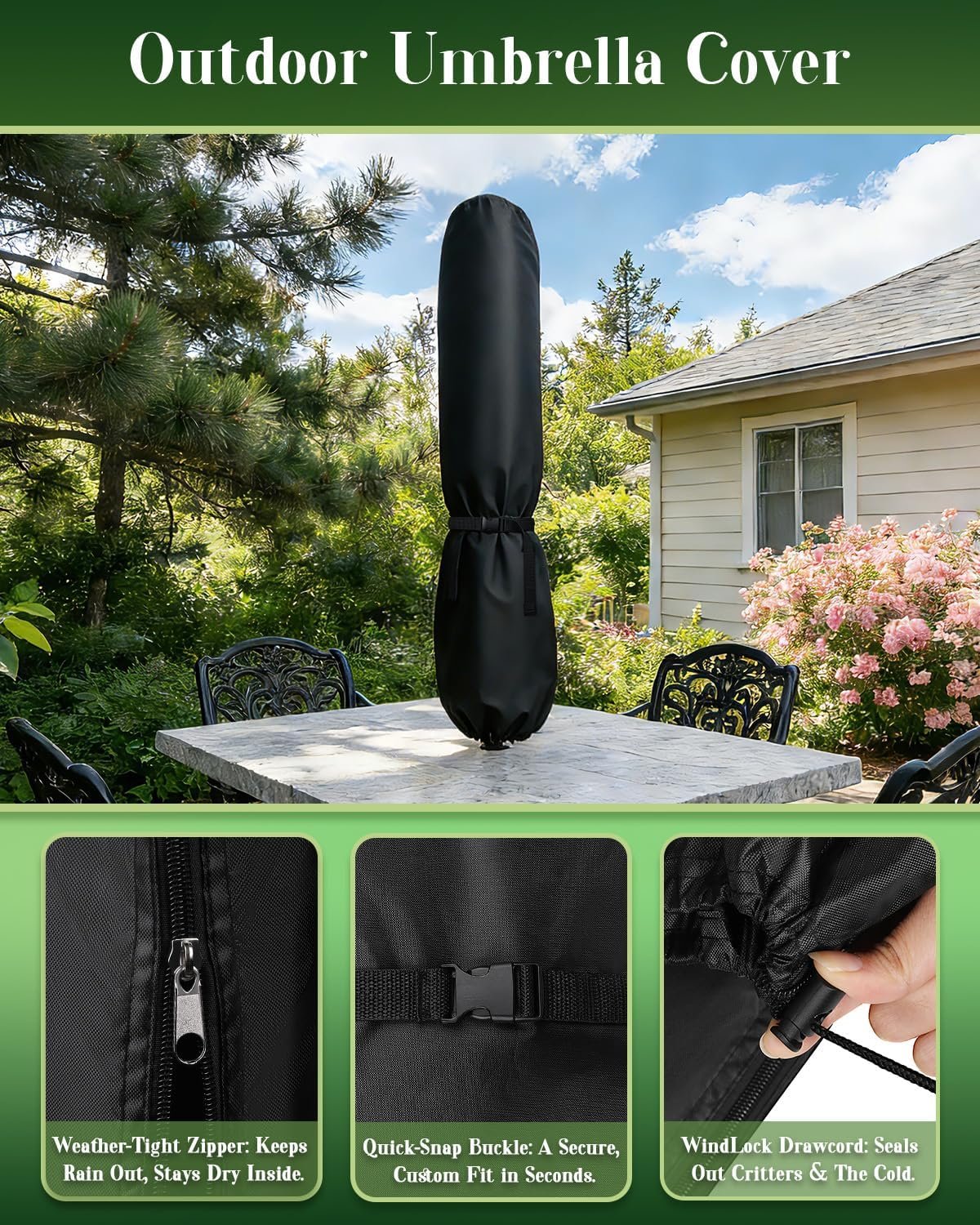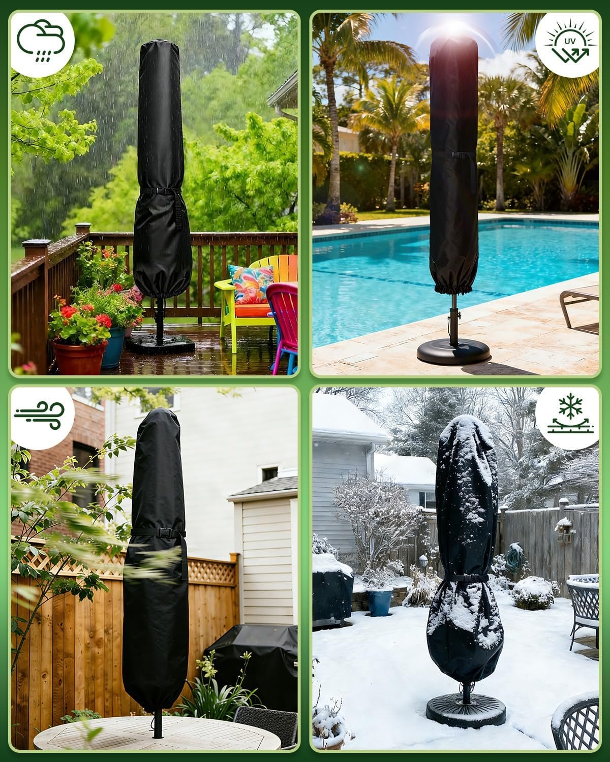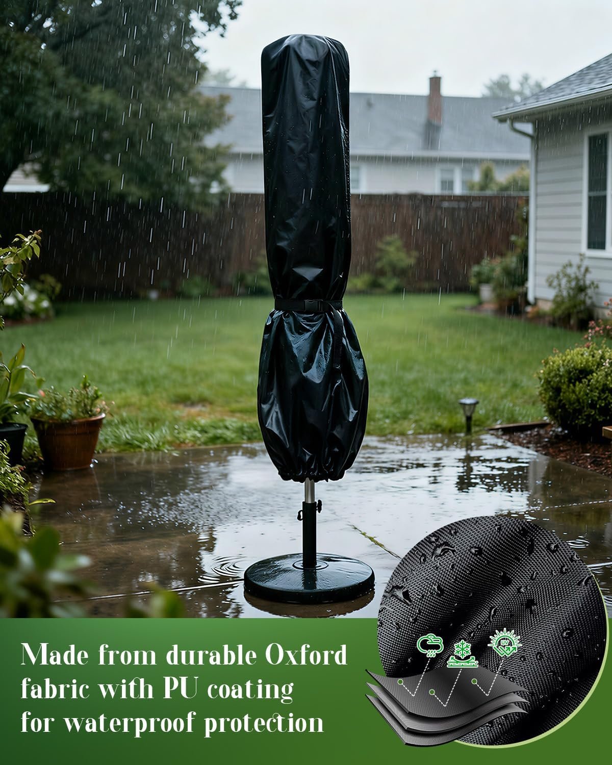 WATERPROOF PATIO UMBRELLA COVER: Our waterproof patio umbrella cover features a dual-layer coating (PU + Hydrophobic) that creates a watertight seal, causing rain to bead up and roll off instantly. The breathable fabric ensuring your outdoor umbrella stays dry and fresh in any weather.