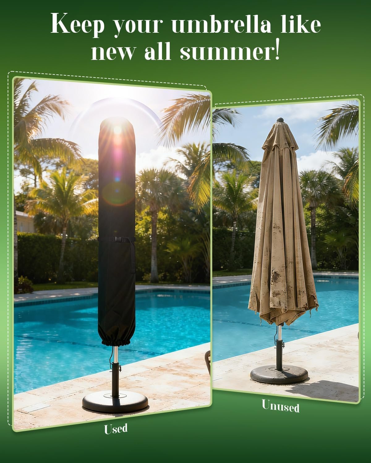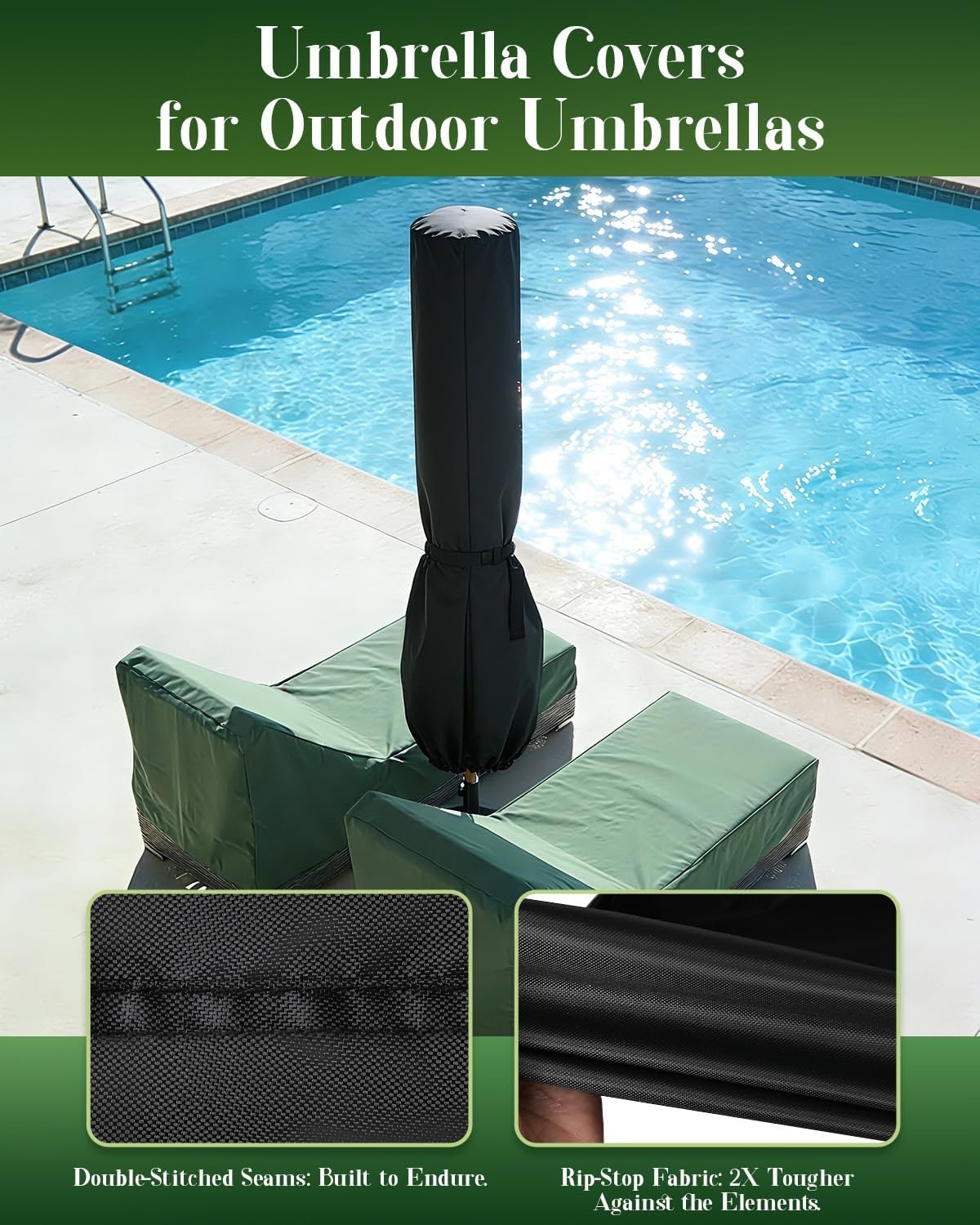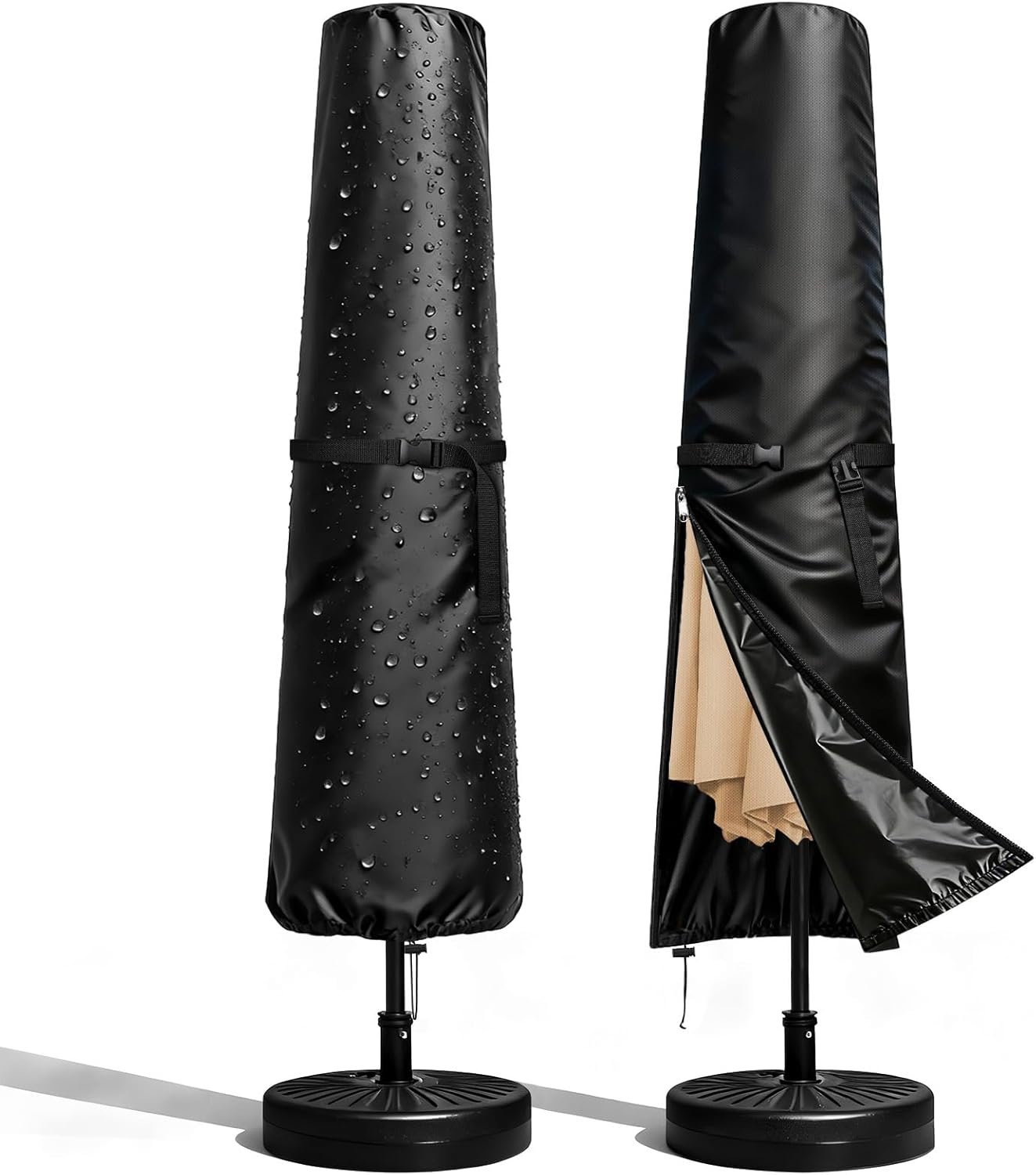 WATERPROOF PATIO UMBRELLA COVER: Our waterproof patio umbrella cover features a dual-layer coating (PU + Hydrophobic) that creates a watertight seal, causing rain to bead up and roll off instantly. The breathable fabric ensuring your outdoor umbrella stays dry and fresh in any weather.