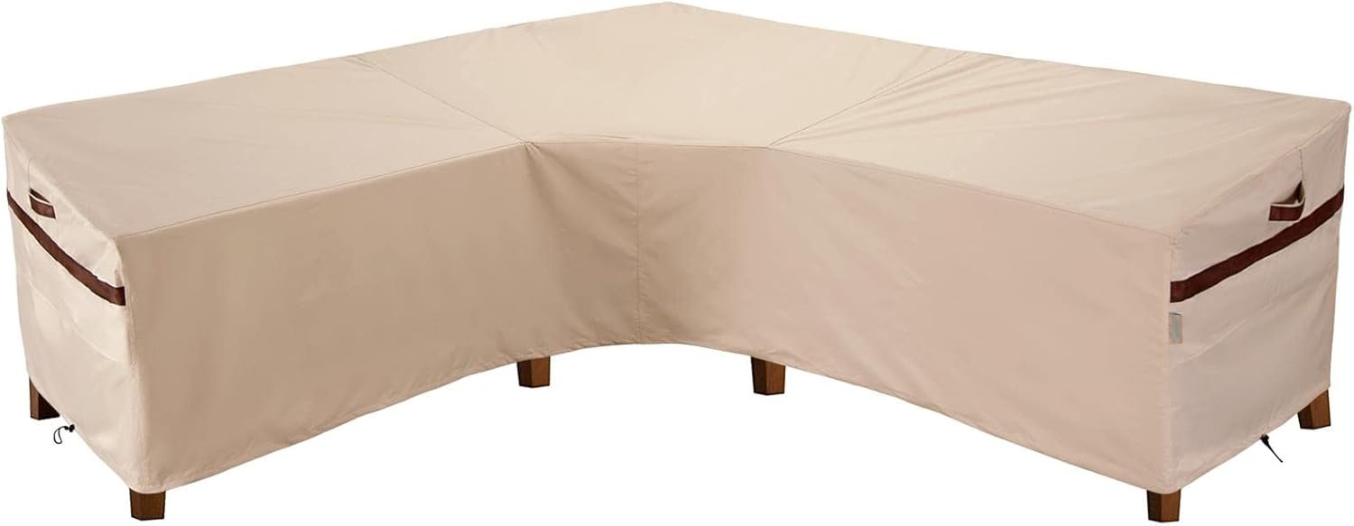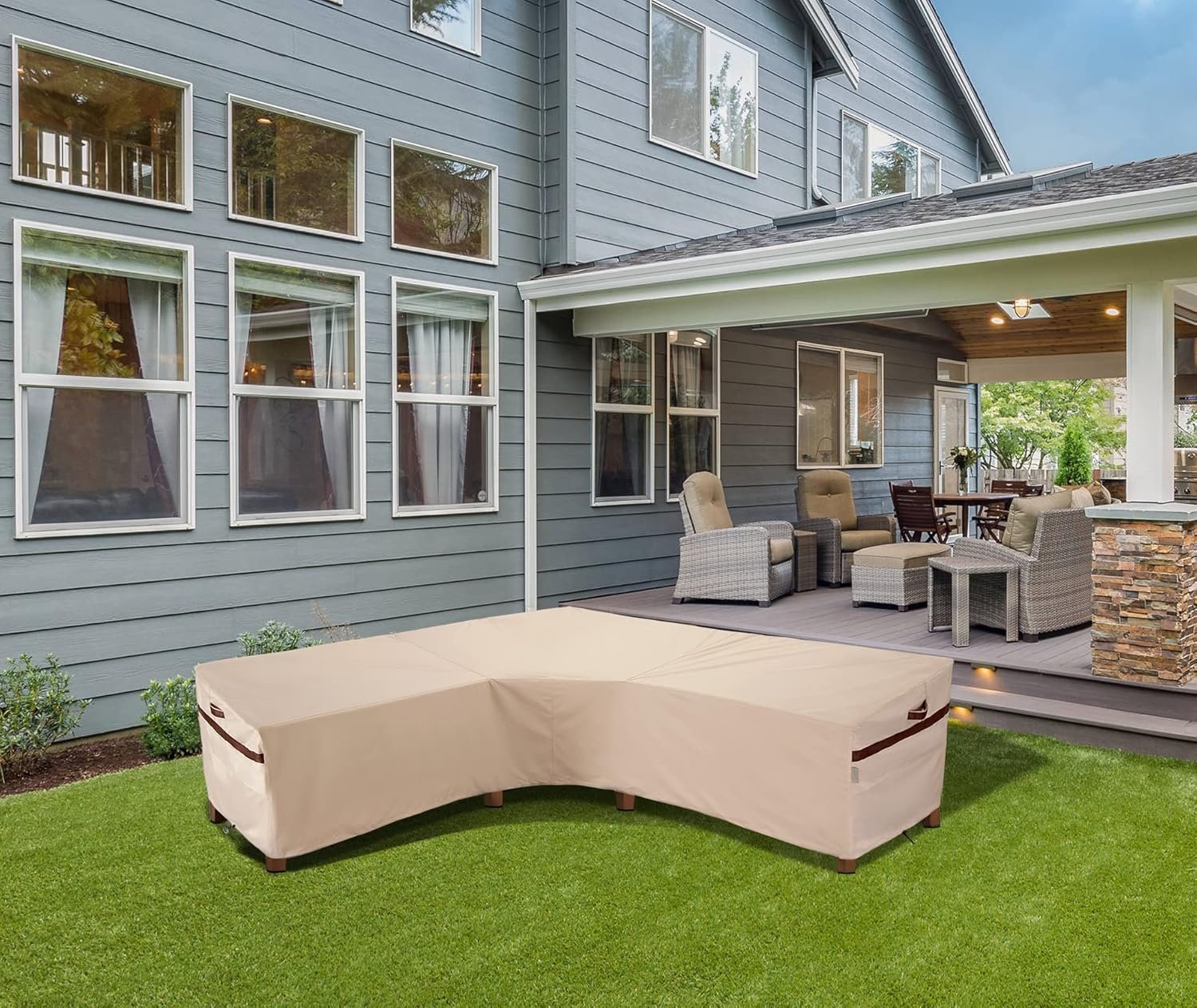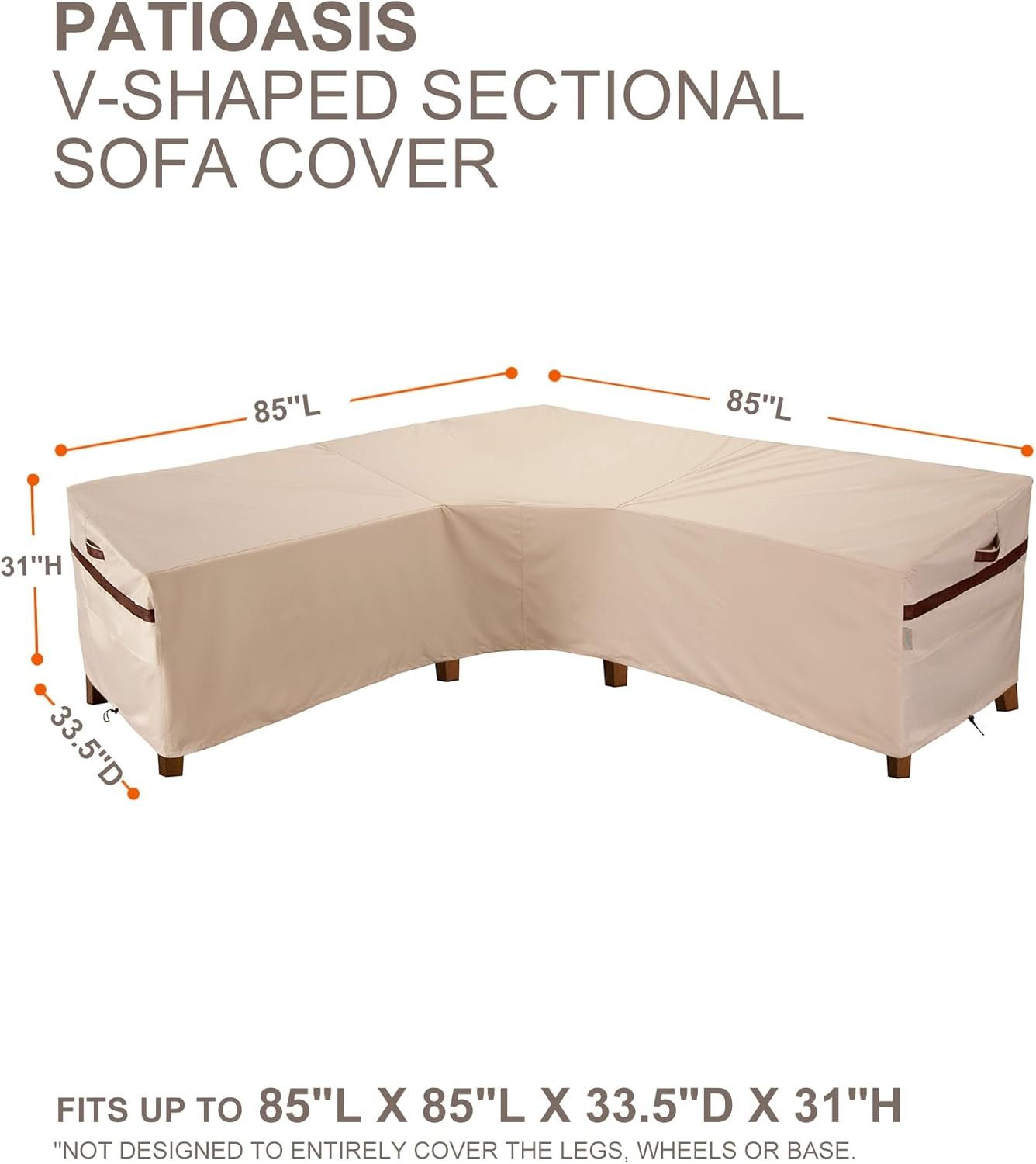 PATIOASIS Heavy duty v-shaped sofa cover perfect to protect your patio furniture away damage from nature elements. Full coverage design avoids the exposure of furniture in the sun makes your backyard lounge set always look like new.