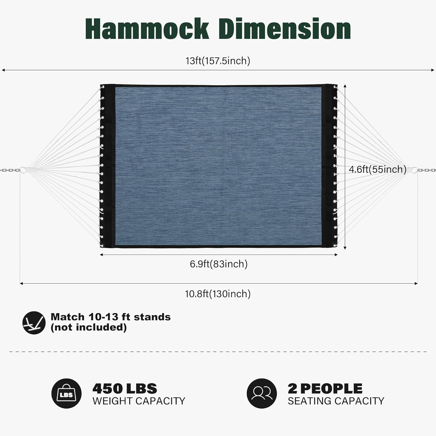 Size And Weight Capacity: The Double hammock measures 83 inches x 55 inches, with a maximum weight capacity of 450 pounds. Complete with steel chains, the total length of the hammock spans 13 feet. Equipped with two adjustable, multi-link steel chains, you can customize the height to your most comfortable position without any concern of touching the ground