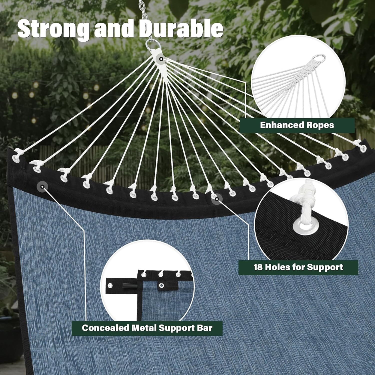 Concealed Support Bar: We’ve replaced the wooden support bar with a sturdy metal one, offering enhanced weight-bearing capacity without the risk of tearing or water-induced corrosion. Rest assured, the aesthetics remain unblemished as this support bar is discreetly enclosed within the interior of the hammock