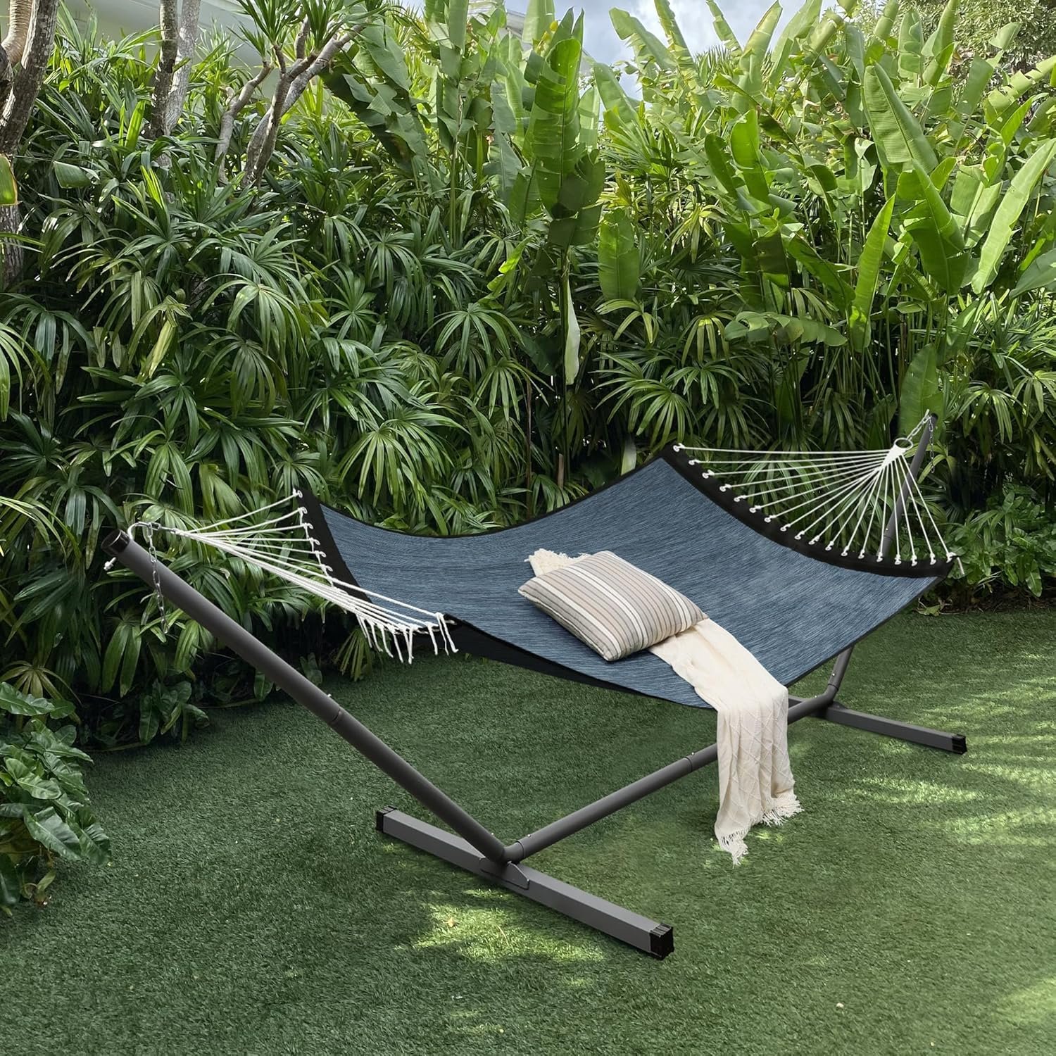 Patio Watcher 13 FT Quick Dry Olefin Hammock – Outdoor Double Hammock with Metal Curved Spreader Bars – 450 lbs Capacity – Dark Blue