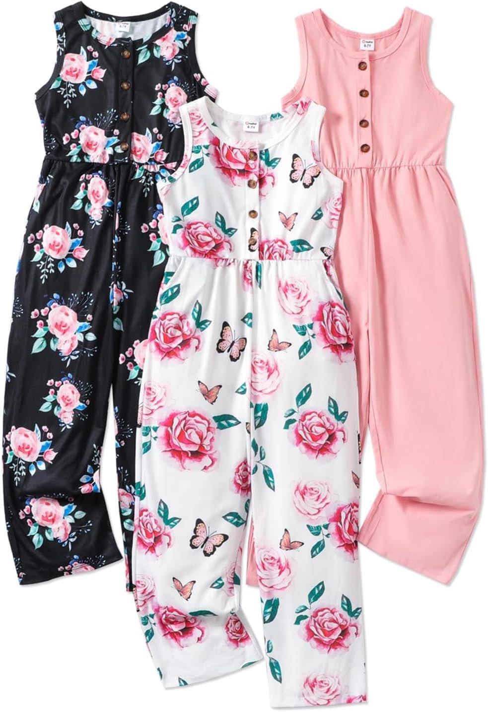 PATPAT 3 Pack Girls Jumpsuits Solid Color Floral Print Button Down Sleeveless Jumpsuits Long Romper Pants with Pockets 5-12Y