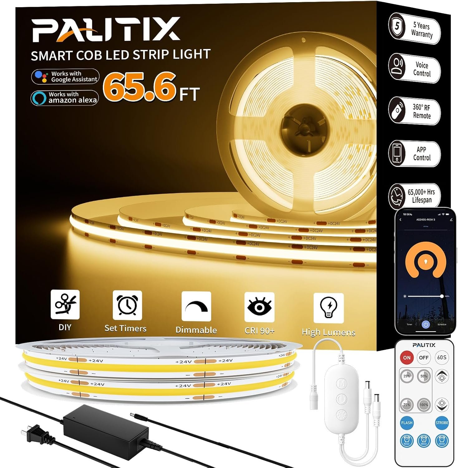 PAUTIX COB LED Strip Lights 65.6ft/20m Warm White 2700K LED Light Strip,Compatible with Alexa/Google Assistant,Dimmable LED Strips for Bedroom,Cabinet,Living Room,CRI93+ Super Bright High Lumen