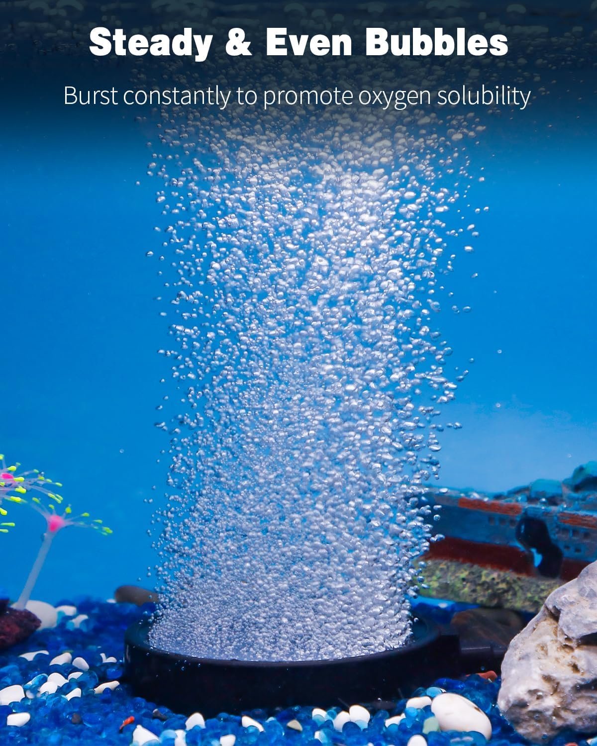 Medium Bubbles: The air stone can produces abundant dense bubbles to aerate your water reservoirs. A great way to increase oxygen solubility in your aquarium and enliven the aquatic lives.