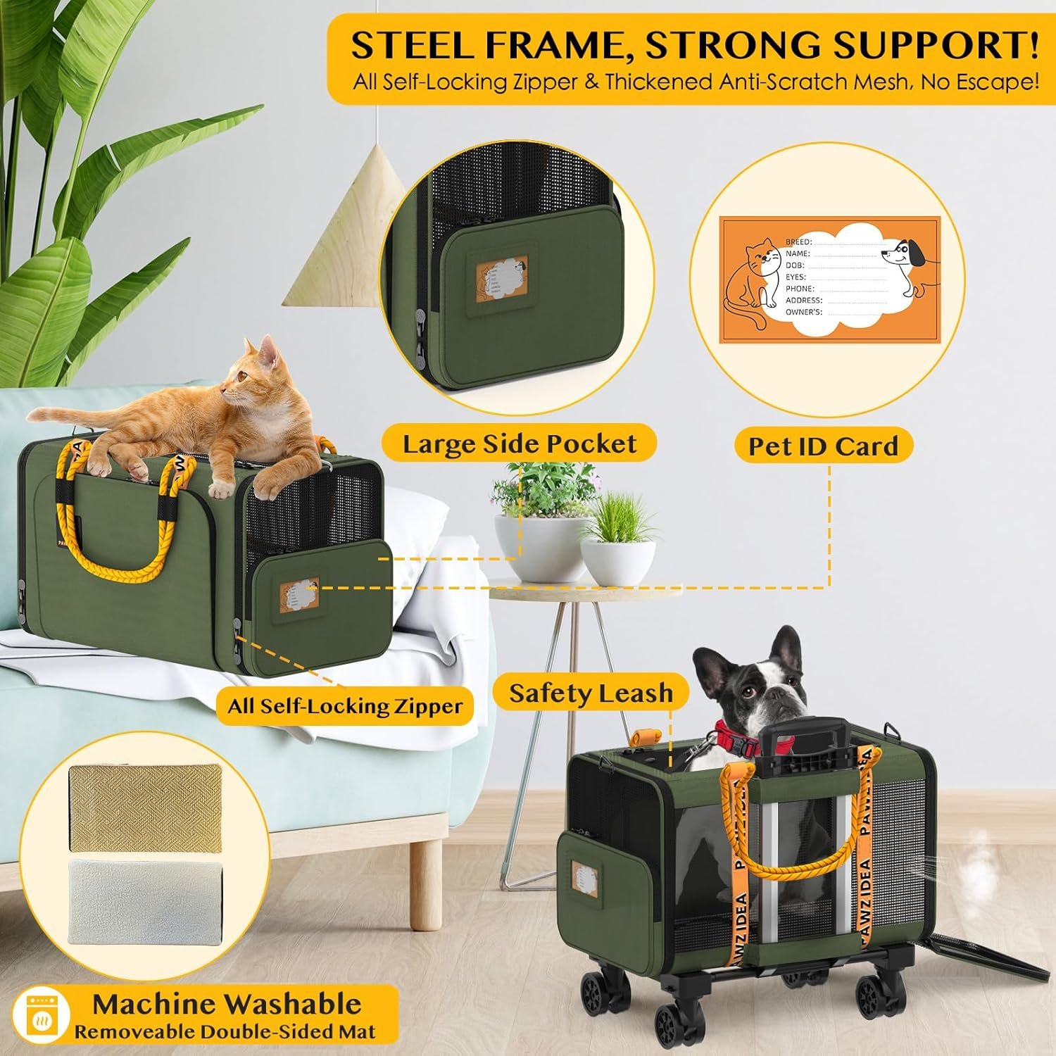 PAWZIDEA Expandable Pet Carrier with Wheels, 18X11X11 TSA Airline Approved Cat Carrier w/ID Card for 2 Cats, Small Dog Carrier Car Seat Travel Bag, Shoulder Strap as Dog Leash