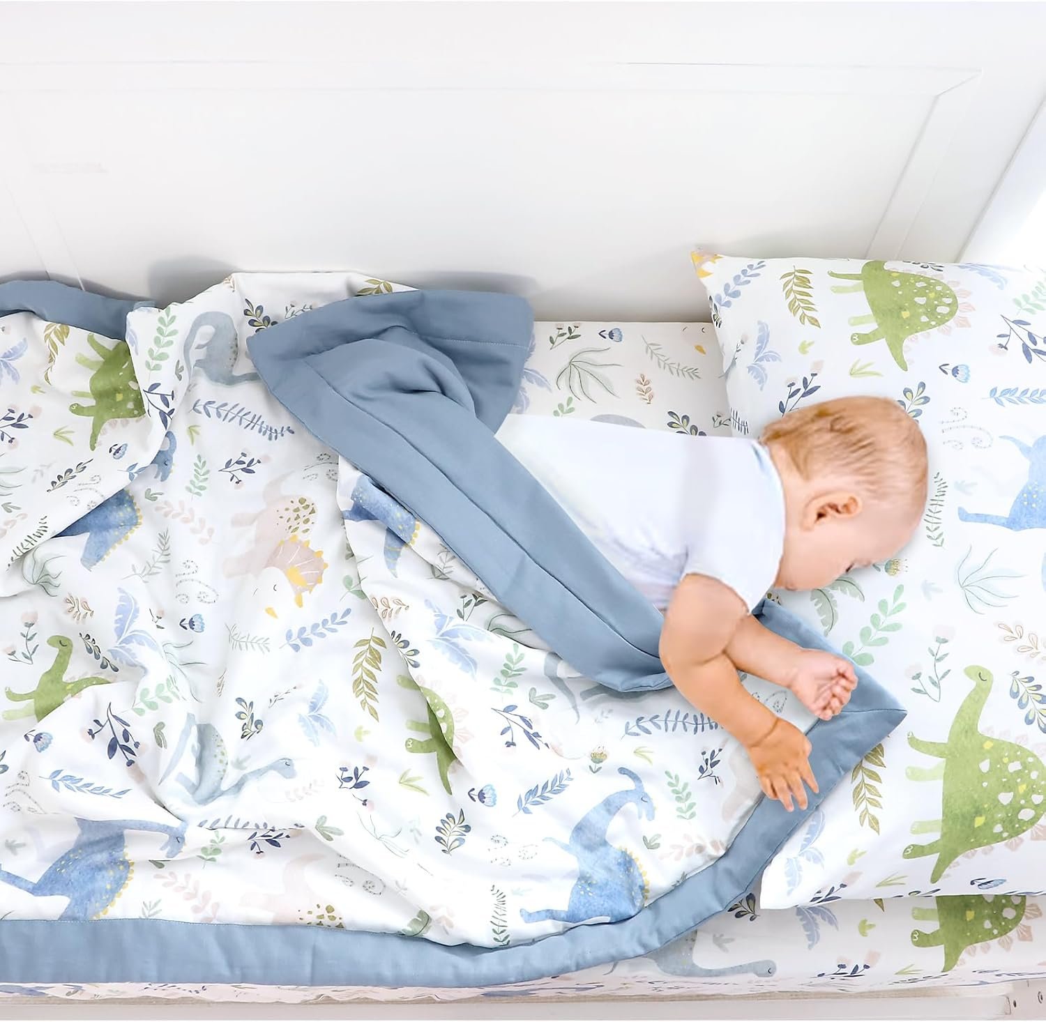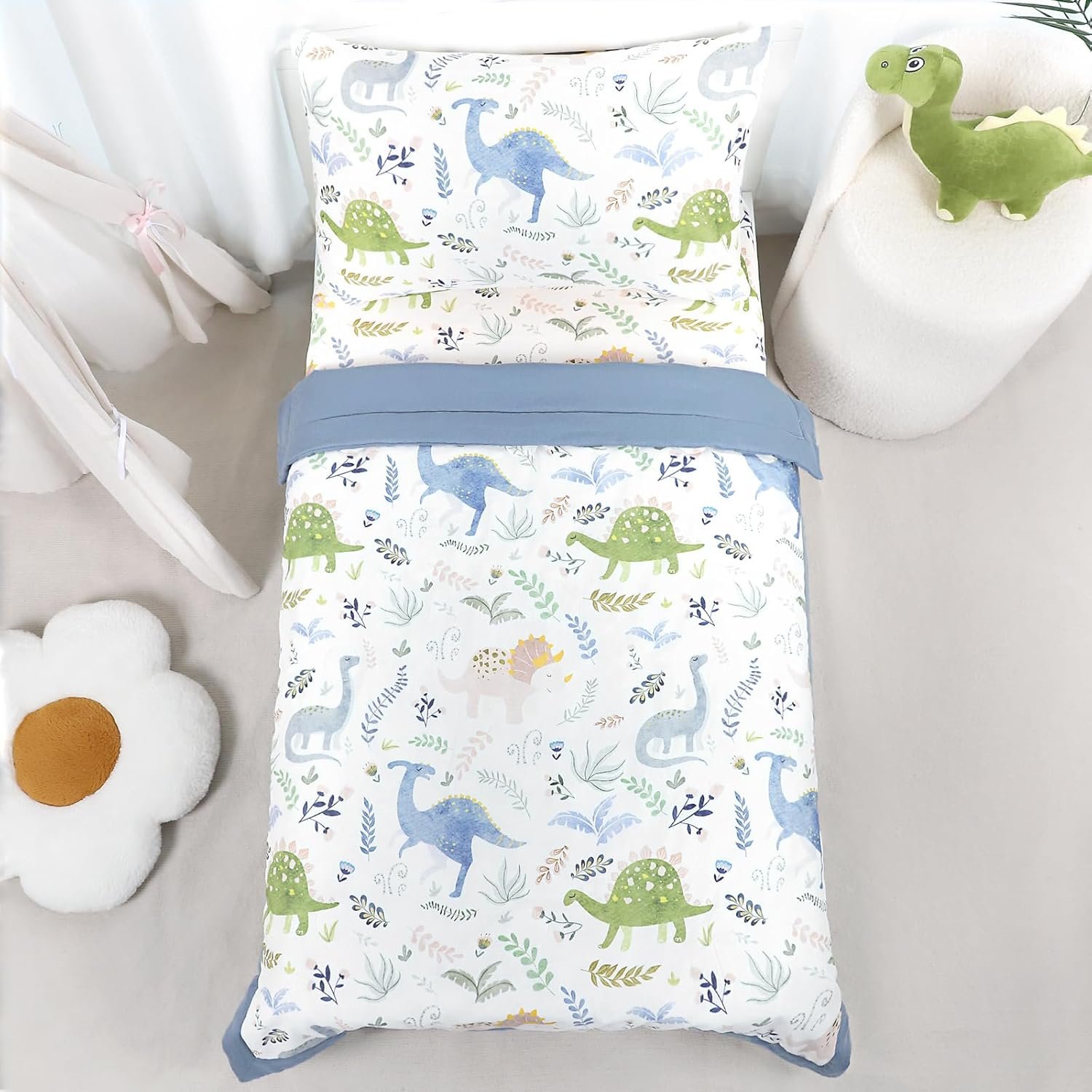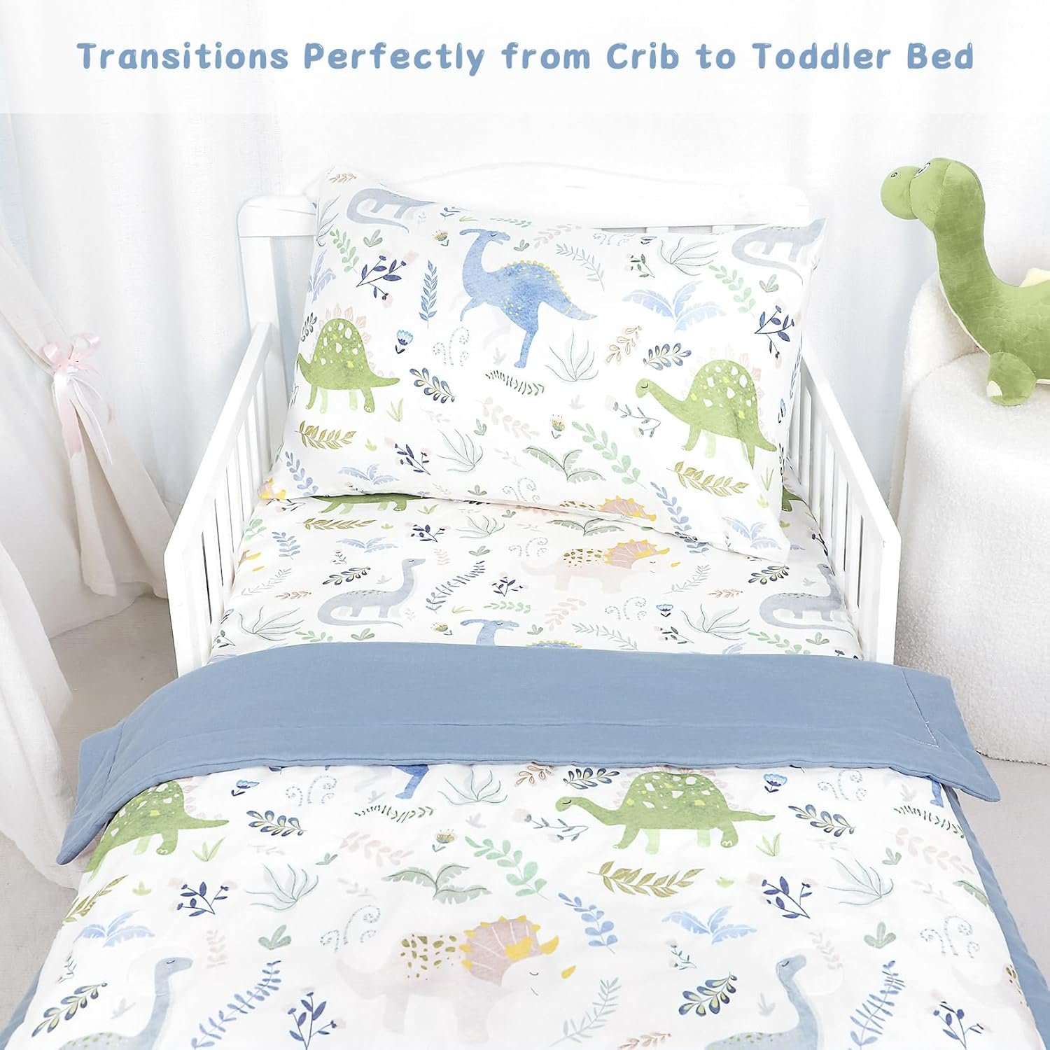 Pea Pod Muslin Toddler Bedding Set 3-Piece – Soft Breathable Crib Bedding with Fitted Sheet, Quilt & Pillowcase for Infant & Kids Bed | Machine Washable Nursery Bed Set (Dinosaur)