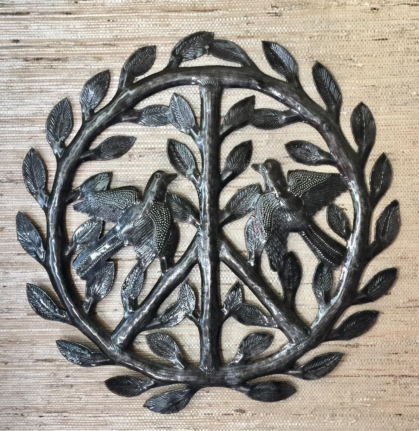 Hanging this sculpture is easy.  It doesn’t have a hanger attached because it doesn’t need one!  Simply hammer one small nail near the center of the piece, such as in the lower notch of the peace sign, to balance it.  Then use a second small nail underneath one of the leaves to secure it firmly to the wall.  You’ll find that the nails “disappear” into the sculpture.  Be careful not to use the eyes of the birds for your nails, however.  The viewer’s gaze naturally goes to their eyes and if the nail is there, the detail is lost and the “disappearing act” fails. You don’t want that!