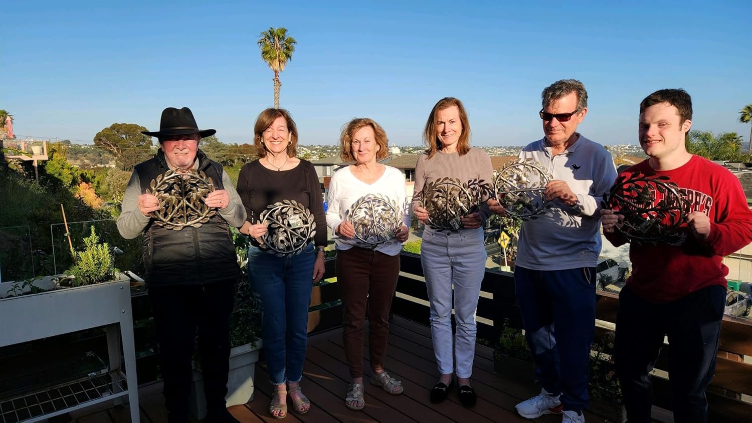 Made of recycled steel, this sculpture can rust outdoors over time, but it doesn’t have to.  It comes with an enamel coating that will protect it from the elements for a while, depending on exposure.  After about a year, it will need a quick touch-up. Five minutes and a little spray-on clear coat from the hardware store is all it takes to keep this sculpture looking brand new.