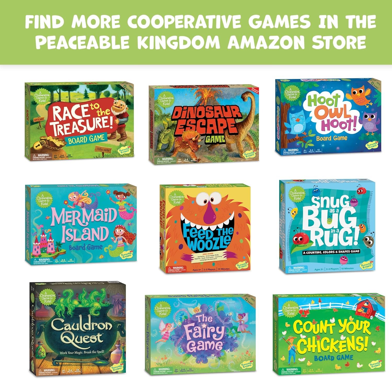 In a cooperative game, players work together as a team, not against each other. Peaceable Kingdom’s cooperative games build confidence, encourage inclusion, and teach kids to share.