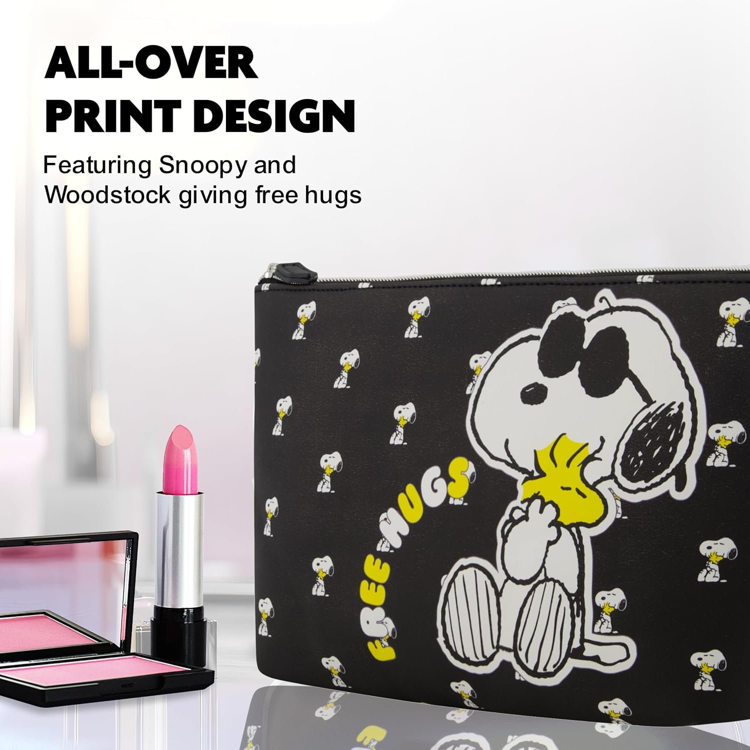 ZIP MAKEUP BAG: This cute and fashionable make up bag features Snoopy embracing Woodstock with love with a bold “FREE HUGS” text in yellow in white, set against a repeat miniatures of Snoopy scattered across the bag, and sleek black and silver hardware, making this cosmetic purse a stylish and practical way to keep your makeup accessories and toiletries easily accessible while on the go
