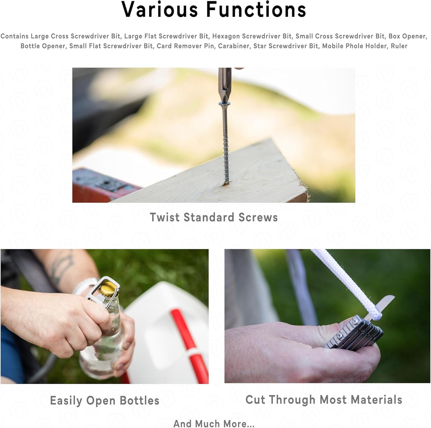 ON-THE-SPOT FIXES: The carabiner multitool is your go to tool to save the day by fixing a loose screw, opening a cold bottle, or slicing open a new package. The multi purpose tool keychain even has a slot to hold your phone upright for hands-free viewing.