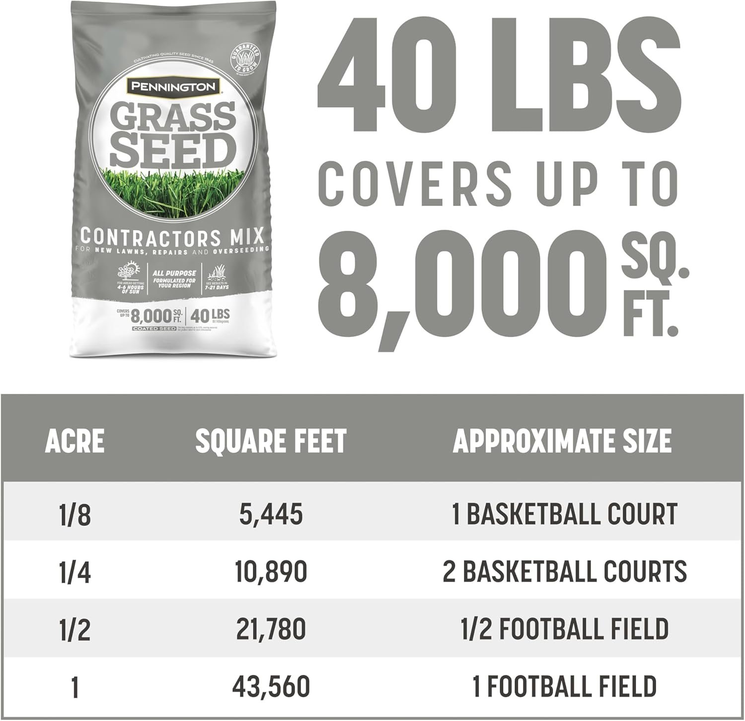 Set the course for a high-performance, professional-grade lawn with Pennington Contractors Mix. This bag contains varieties that are formulated for the Northern US, so you can rest easy knowing the seed mix you buy will provide quick, dense, professional-grade results. This sun-tolerant seed should be planted in the early spring or early fall, and is optimal for areas getting 4 to 6 hours of sun. Once germinated, the grass will grow thick and full. This 40-pound bag covers up to 8,000 square feet for overseeding and 3,330 square feet for new lawns. While most grass seed companies buy their seed on the open market, we are the only major grass seed company that works directly with a network of dedicated growers. Built on decades of trust and integrity, our relationships with seed growers and their families now span multiple generations. Our legacy of working directly with farmers to bring you the finest grass seed possible helps ensure their success and ours. At Pennington, we know our seed and the farmers who grow it. From field to final product, that’s the Pennington way.
