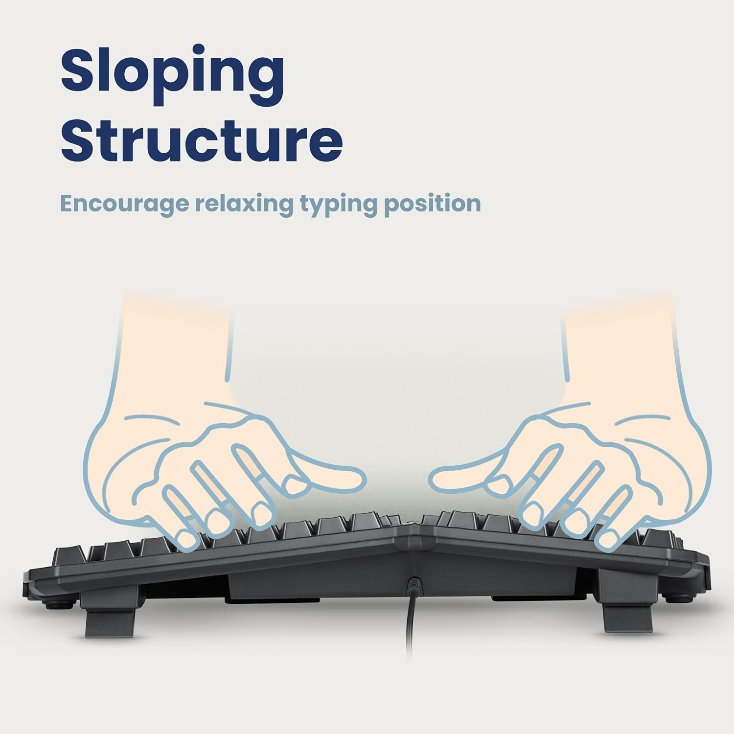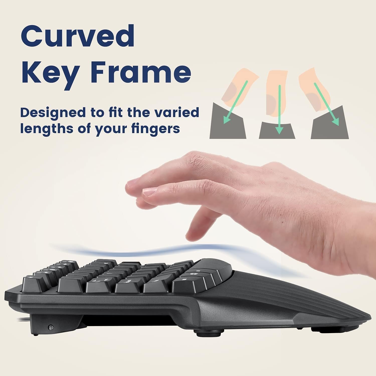 CURVED, SPLIT-KEY DESIGN – Ergonomic keyboard with curved keys and split-key sloped promotes natural arm and hand position while typing. Minimize the discomfort on your shoulders, wrists and forearms after prolonged use