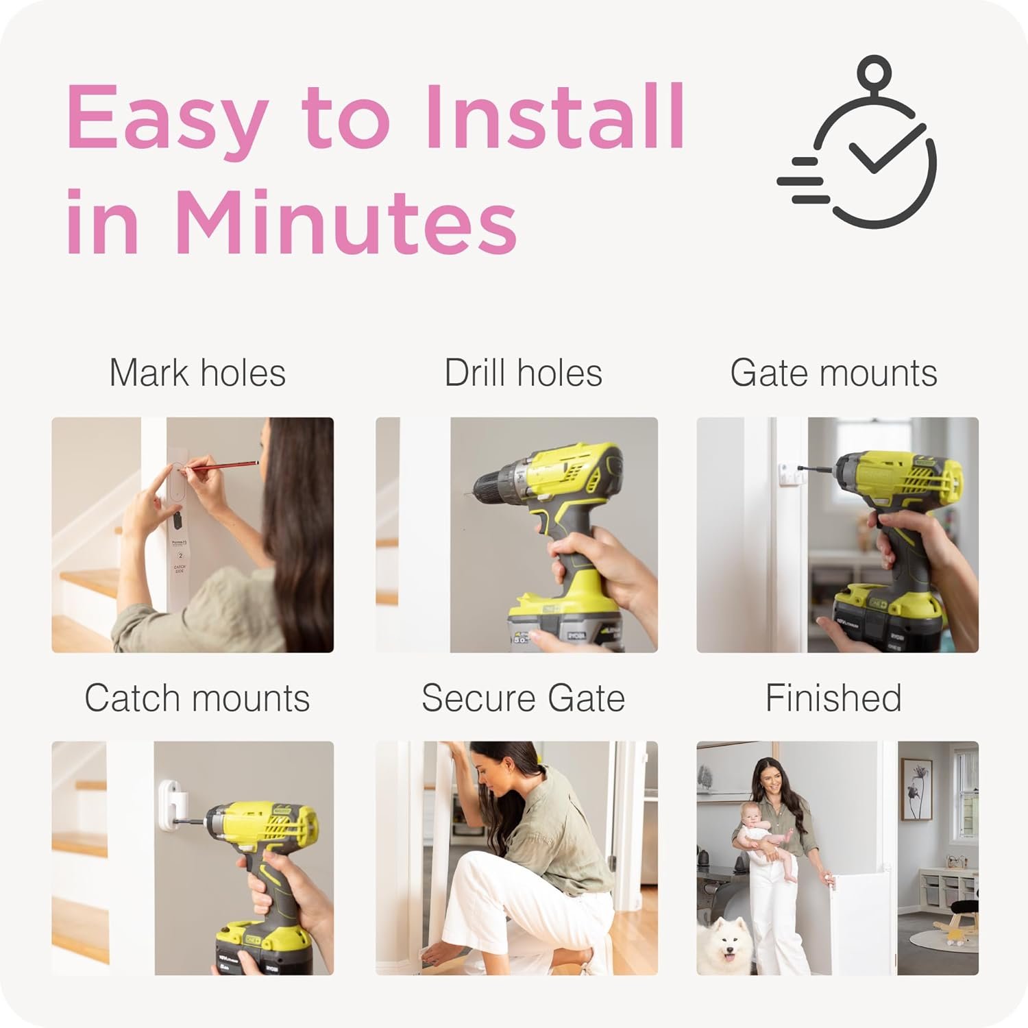 ONE-HANDED OPERATION: Simple 2 step operation: 1. Push, twist, and release button; 2. Pull the handle to extend the gate.