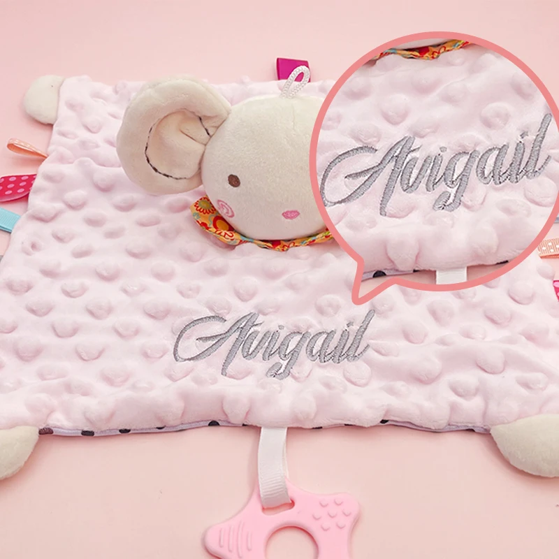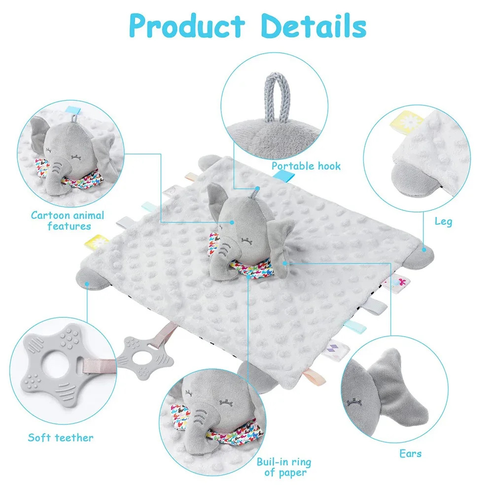 1,Comfortable to Grip: This comfort blanket is comfortable to grip, and the animal shape attracts the babys attention. It can be hung on the stroller, safety seat, and crib as a soothing toy.