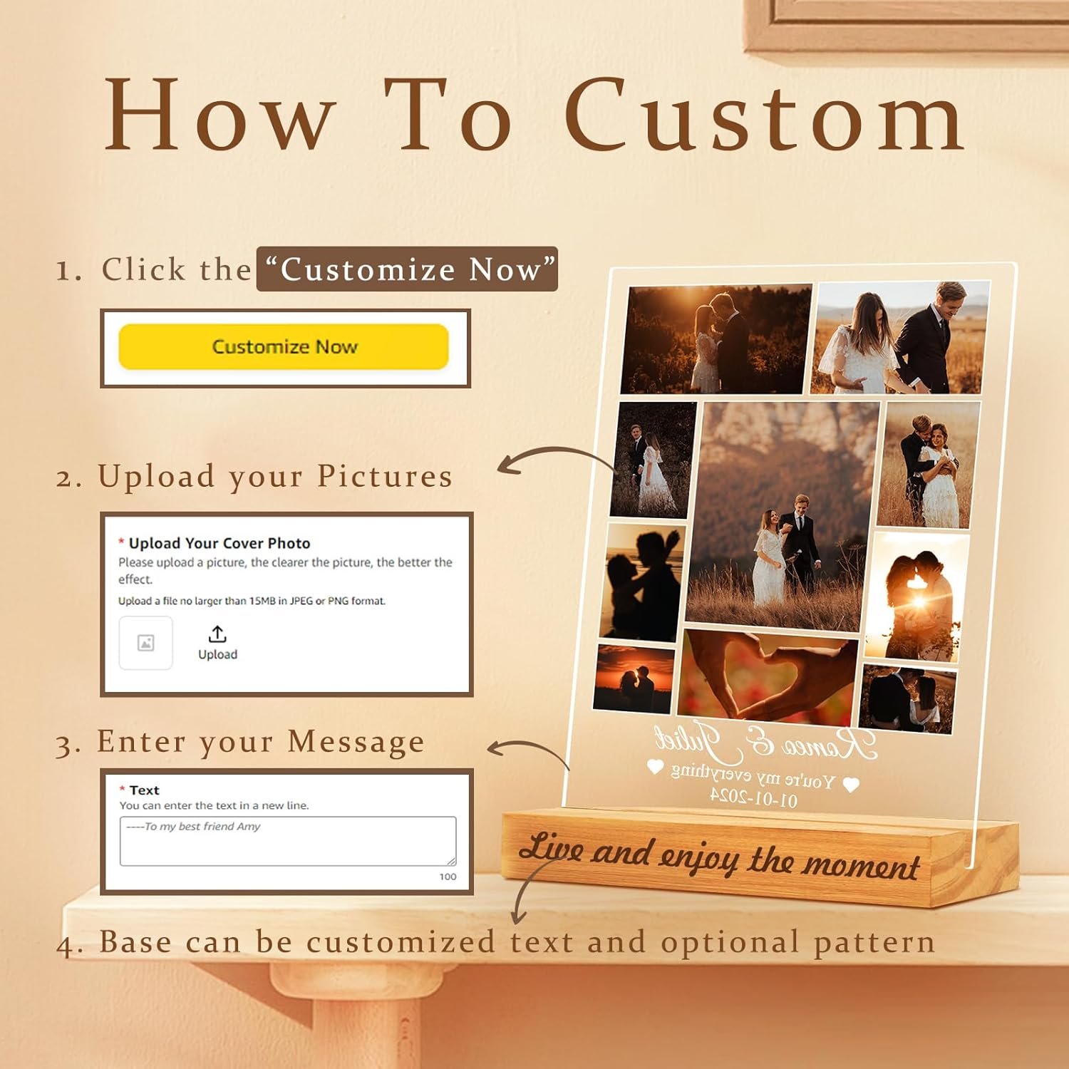 【Customization Steps】①Choose your favorite style and click “Customize Now”; ②Upload your photo and text; ③Choose the size and base;④Whether to add a gift box packaging