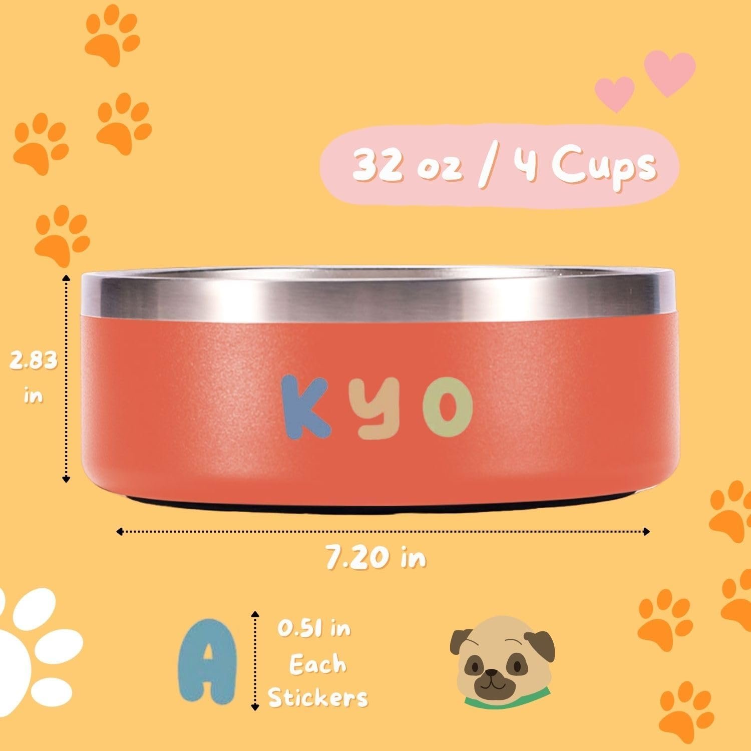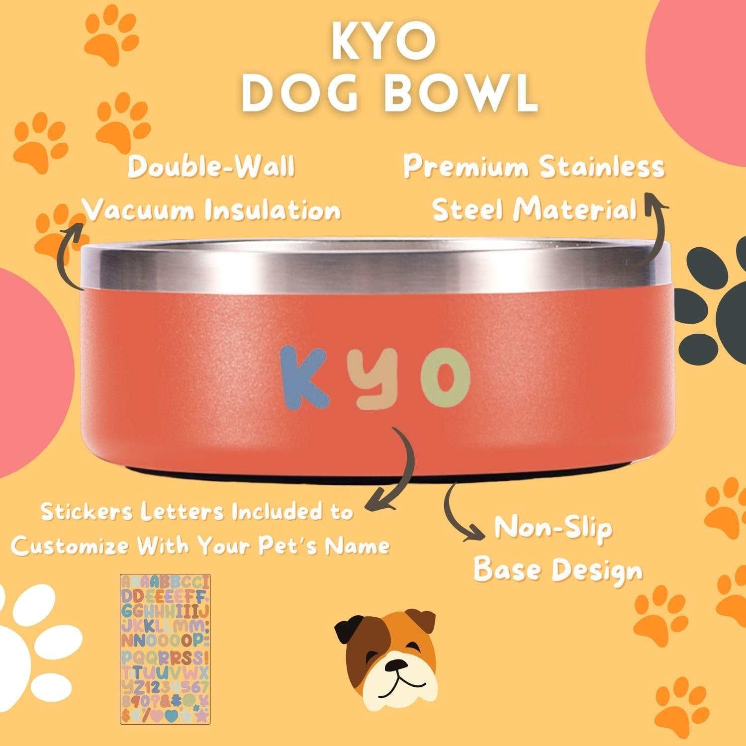 Personalized Dog Bowl – Kyo custom dog bowl with name is the perfect blend of style, functionality, and durability for your furry friend’s dining experience. Crafted with meticulous attention to detail, this dog bowl is designed to cater to the unique needs of your canine companion. With a generous capacity of 32 oz or 4 cups, the Kyo Dog Bowl provides ample space for both dog food and water, ensuring your pet stays hydrated and well-fed throughout the day. The unique size is tailored to meet the specific requirements of medium to large breeds, offering a practical solution for pet owners who prioritize quality. Constructed with pro-grade stainless steel 18/8, this stainless steel dog bowl boasts exceptional strength and corrosion resistance, making it an ideal choice for those in search of durable and long-lasting pet accessories. The use of double-wall vacuum insulation helps to maintain the ideal temperature of your pet’s meals, keeping dog food fresh and water cool for longer periods. Rest assured, the materials used are food-safe, prioritizing the health and well-being of your beloved pet. Featuring a non-slip base design, the Kyo Dog Bowl stays firmly in place, preventing accidental spills and minimizing mess during dog food and water consumption. This thoughtful design element adds an extra layer of convenience for both pets and their owners. The non-slip base ensures stability, even during enthusiastic eating sessions. Cleaning up after your pet is a breeze with the Kyo Dog Bowl. Its design prioritizes easy maintenance, and the stainless steel dog bowl is dishwasher safe, saving you time and effort. Say goodbye to the hassle of handwashing and hello to a convenient and hygienic solution for your pet’s personalized dog bowl needs. Whether you’re a seasoned pet owner or a new addition to the world of furry companions, the Kyo Dog Bowl is a testament to quality and functionality. Elevate your pet’s dining experience with a personalized dog bowl that not only meets the highest standards of craftsmanship but also adds a touch of sophistication to your home. Choose Kyo for a dog bowl that’s as unique as your four-legged friend.
