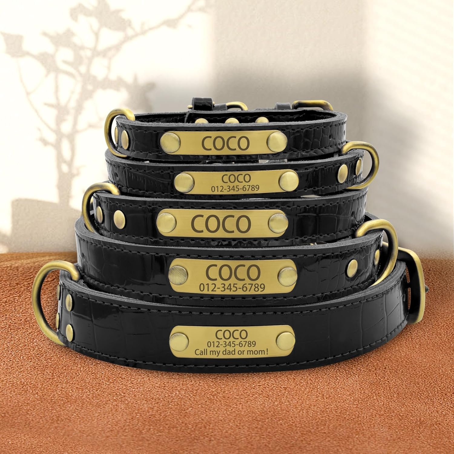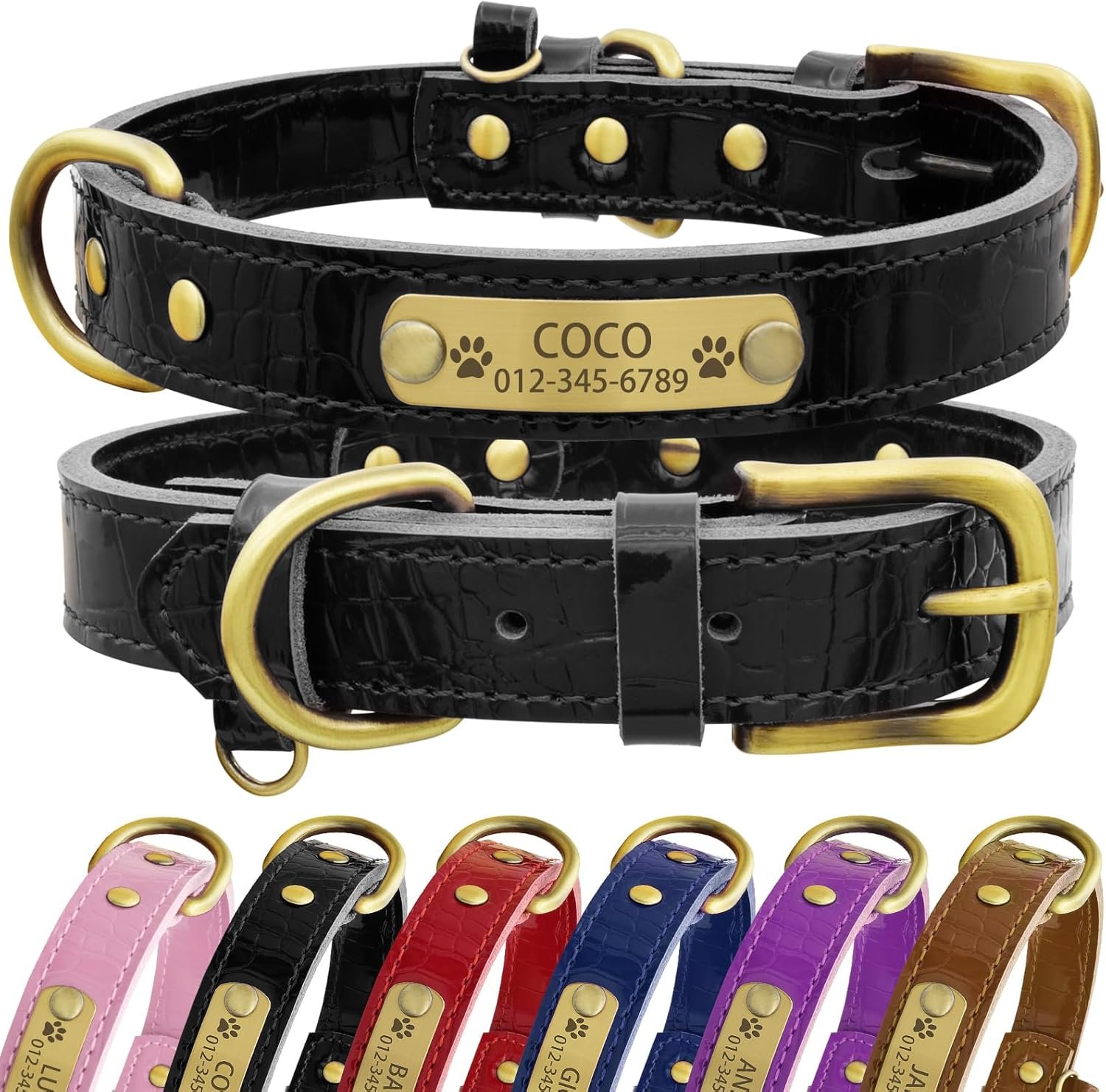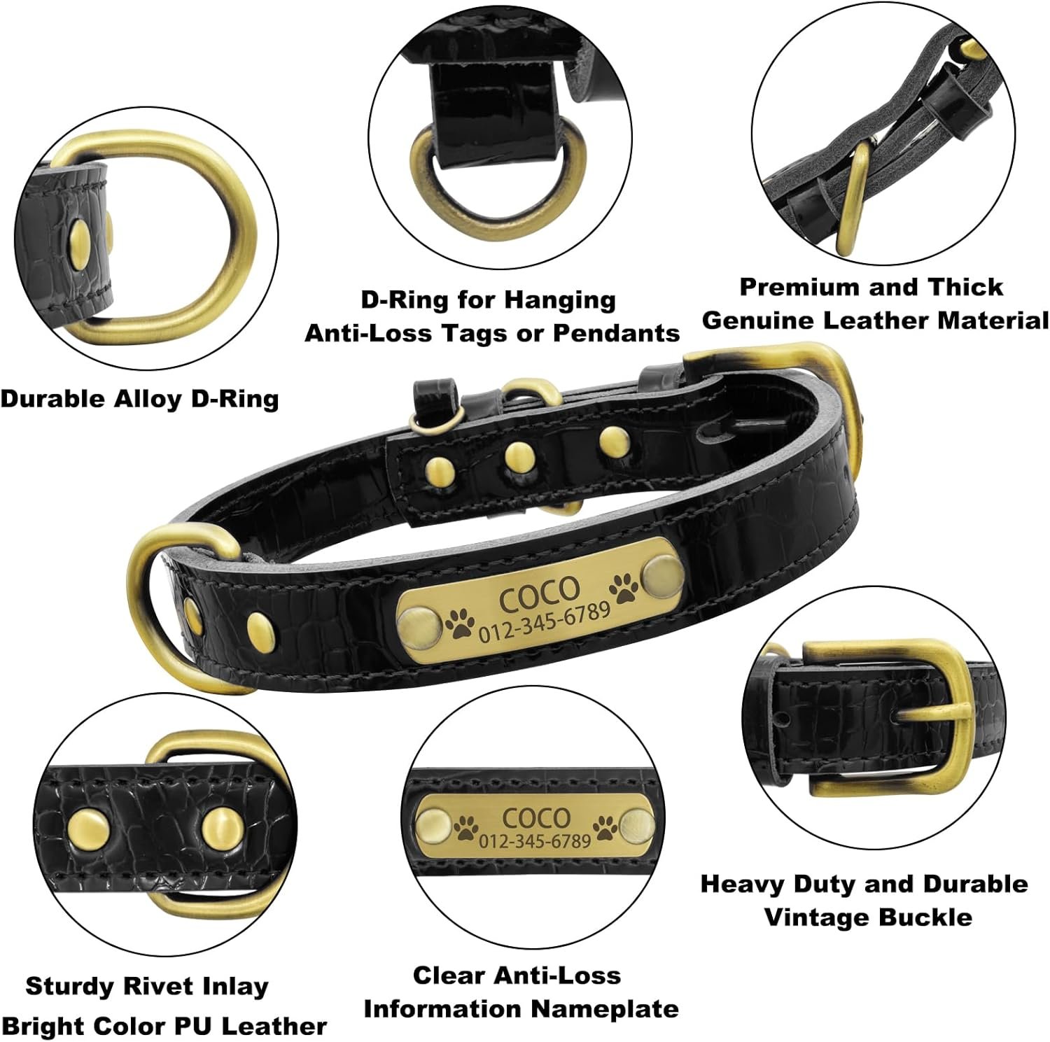 Personalized Design: Each genuine leather dog collar comes with a custom name plate.With three lines of engraving information available, you can include important details such as your pet’s name, your phone number, and any other key information to help prevent loss.Laser engraved dog collars will display your pet’s name and your contact information at a glance, ensuring their safety and your peace of mind.