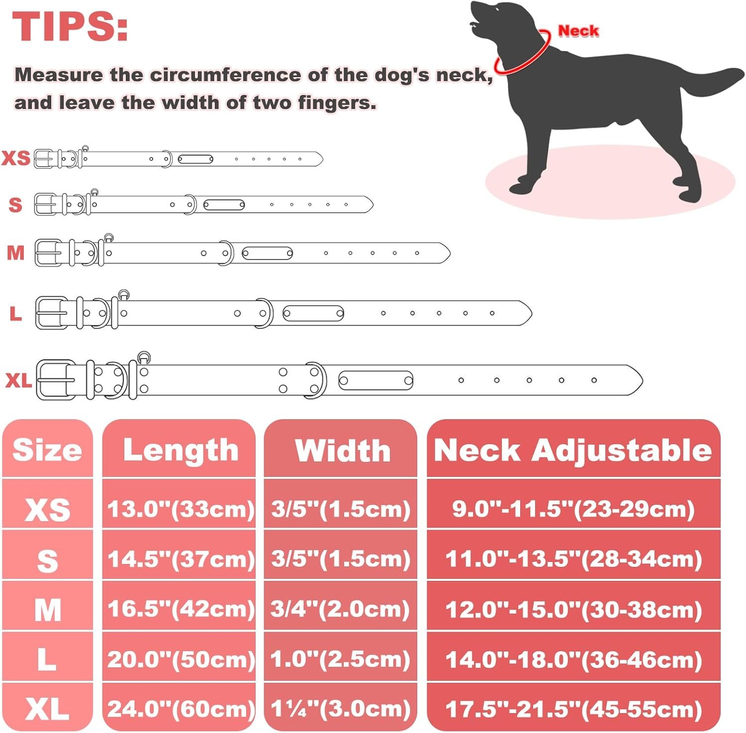 All Sizes: We offer five size options — XSmall:(Width:3/5” , Neck:9.0”-11.5”) , Small:(Width:3/5” , Neck:11.0”-13.5”) , Medium:(Width:3/4” , Neck:12.0”-15.0”) , Large:(Width:1.0” , Neck:14.0”-18.0”) , XLarge:(Width:1¼” , Neck:17.5”-21.5”).Ideal for boys or girls small, medium and large dogs