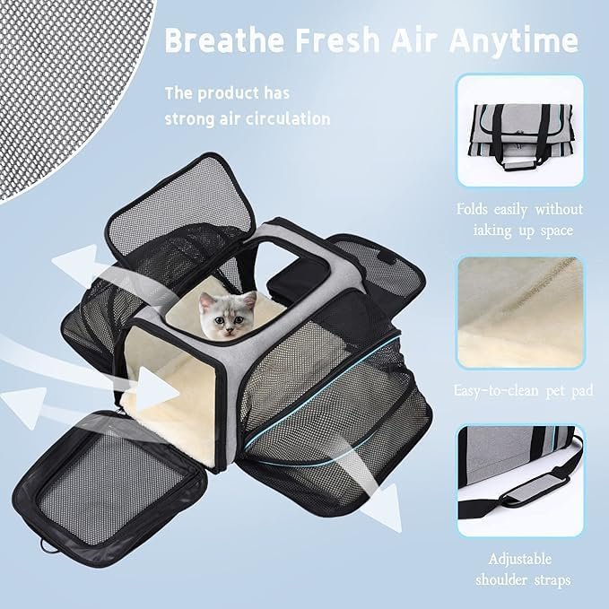✅ 【Durable Materials】Dog carrier tsa approved design microfiber frame prevents top sag and remains firm and stable even when fully expanded. Does not fold or deform like other pet bag carrier. The cat carrier collapsible is designed with a hard PP pad, and the bottom helps to fix and increase the load, avoiding deformation when carrying. The padding is made of suede and polyester and is washable for easy cleaning.