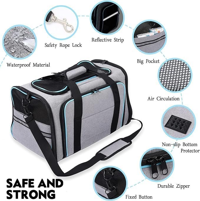 ✅ 【Soft Sided Pet Carrier Design】4 ways to open the carrier from 4 directions, making it easier and safer for your dog and cat to get in and out. Mesh fabric increases breathability and visibility in all conditions give your cat dog a better vision and air circulation.There adding reflective bands on side for night recognition. Enlarged storage pockets to carry more accessoris.The enlarged top opening allows you to comfort your pet at any time and avoid pet anxiety.