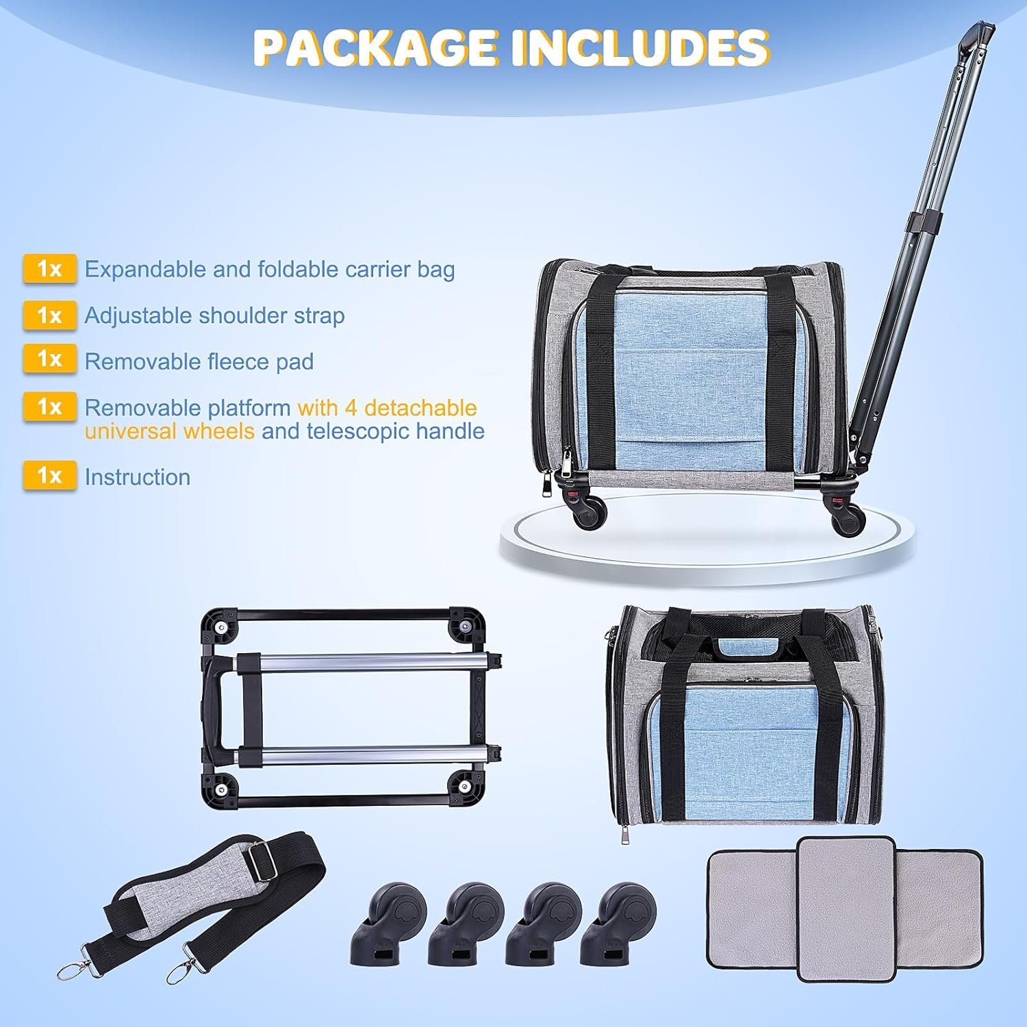Expandable and Secure Rolling Pet Carrier for All Types of Travel: Both sidewalls expand, creating a spacious area for your pet to move and rest comfortably. This cat travel carrier’s flat, durable design includes a built-in luggage strap, so you can attach it to your suitcase, keeping your hands free while walking through airports. With a detachable roller feature and a convenient door, this soft sided cat carrier has everything needed for safe, smooth, and versatile transport of your animals.