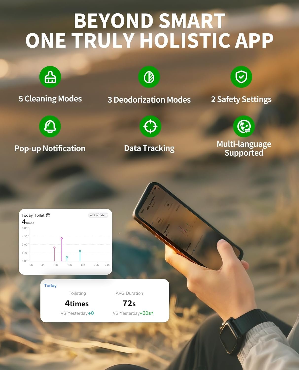 Smart App Control: 2.4GHz enabled, all-in-one app for holistic toilet data and remote control. With the PETKIT smart app, you can track the litter box usage data, check working status and set cleaning modes. The smart litter box automatically identifies cats based on their weight.Each cat’s weight,toilet frequency and duration will be recorded on the app. By tracking the clear data records, you will gain more insight into your pet’s health and identify any irregular occurrences.