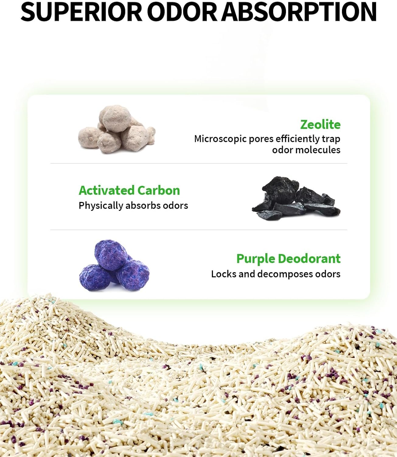 EFFICIENT ODOR CONTROL: Activated carbon physically absorbs odor molecules, purple deodorant locks and decomposes odors. Zeolite has a unique crystalline structure filled with microscopic pores. These pores highly effectively trap odor molecules such as ammonia and hydrogen sulfide in cat waste, reducing the unpleasant smells in the litter box.