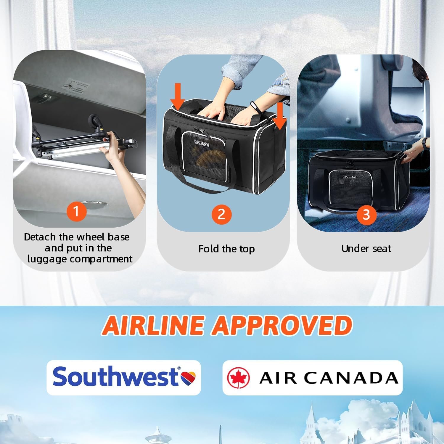 【AIRLINE APPROVED CARRIER 】Unfolded size:18″L×13″W×(9.5+3.5)”H, Petskd pet carrier is TSA approved and can be placed under the seat in the cabin(after remove the wheel base), it is mainly designed for ①Southwest Airlines, but also in compliance with ②Air Canada”. We recommend you buy this carrier when you fly with the above-mentioned airlines.