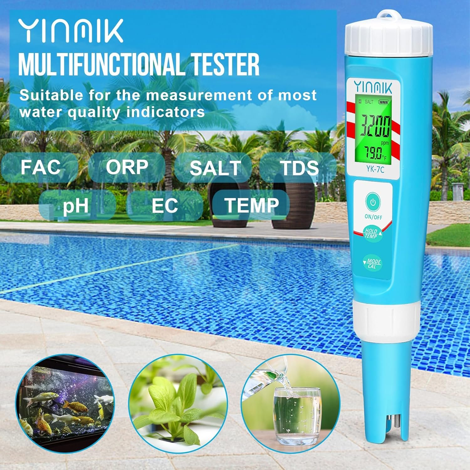 [Widely Application] The YINMIK test meter also has the function of EC TDS ORP Temp., which not only monitors the swimming pool water quality; but it can also be used to measure aquarium, hydroponics, drinking water, brewing, well water, pond water. Is the environment of your sea fish within the appropriate salinity and PH range; Is the EC of hydroponic plants appropriate; Is your drinking water TDS below 50ppm? YINMIK multifunctional 7-in-1 test pen will tell you the answer.