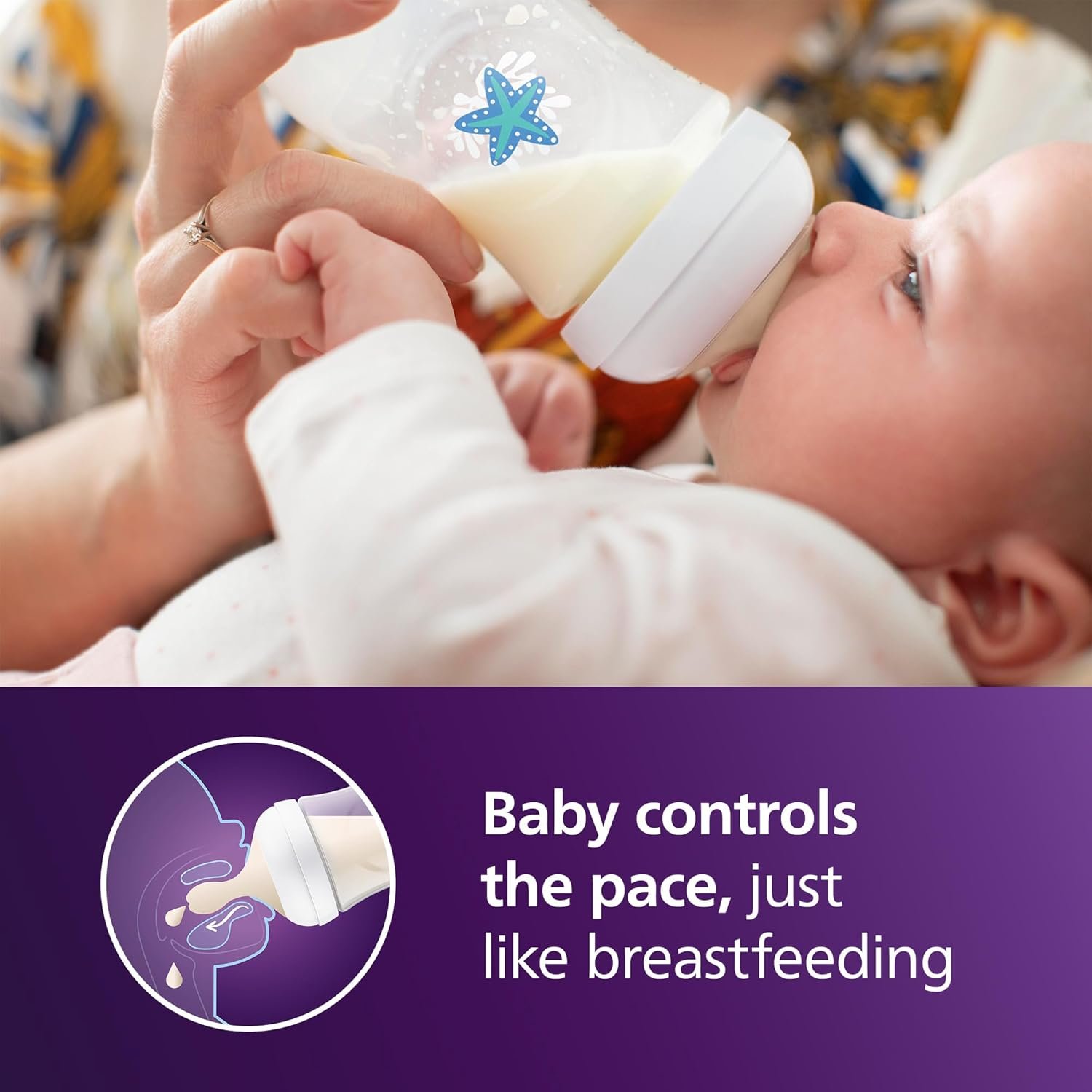 Philips Avent Natural baby bottles support the well-being of your baby so you can take the best care of yourself. The Natural Response nipple with the unique opening and tip lets your baby control the pace of the milk flow, releasing it only when actively drinking – just like babies do during breastfeeding. When pausing to swallow and breathe, no milk flows. Feeding feels as natural as from the breast! Easily combine breast and bottle feeding with a wide, soft and flexible nipple that mimics the shape and feel of a breast. It helps the baby to latch on and feed comfortably, using its natural rhythm. With the no-drip design, the nipple helps prevent spills and lost milk. An anti-colic valve integrated into the nipple is designed to reduce colic and discomfort by sending air away from your baby’s tummy. The ergonomic shape makes it comfortable for parents to hold and easy for small fingers to grasp. Assembly is simple, with only a few parts, while the wide bottleneck makes filling and cleaning easy. Philips Avent Natural bottle is made from polypropylene, a BPA-free material. It works with all nipples and caps from the Natural Response range. The set includes 2 clear bottles and 2 bottles with seahorse and starfish design. It is totally natural for your baby to take 2-3 tries to get milk flowing from a new bottle. We have 5 different nipple flow rates for the Natural bottle – when looking for the right one, age is a guide, but your baby’s approach to drinking and the feeding cues will help determine when to move to a higher or lower nipple flow rate. ¹ IQVIA Health ProVoice Survey 2025, USA. *#1 brand recommended by moms worldwide. Based on an online satisfaction survey conducted globally with 10,109 users of mother & childcare brands and products in 2023.