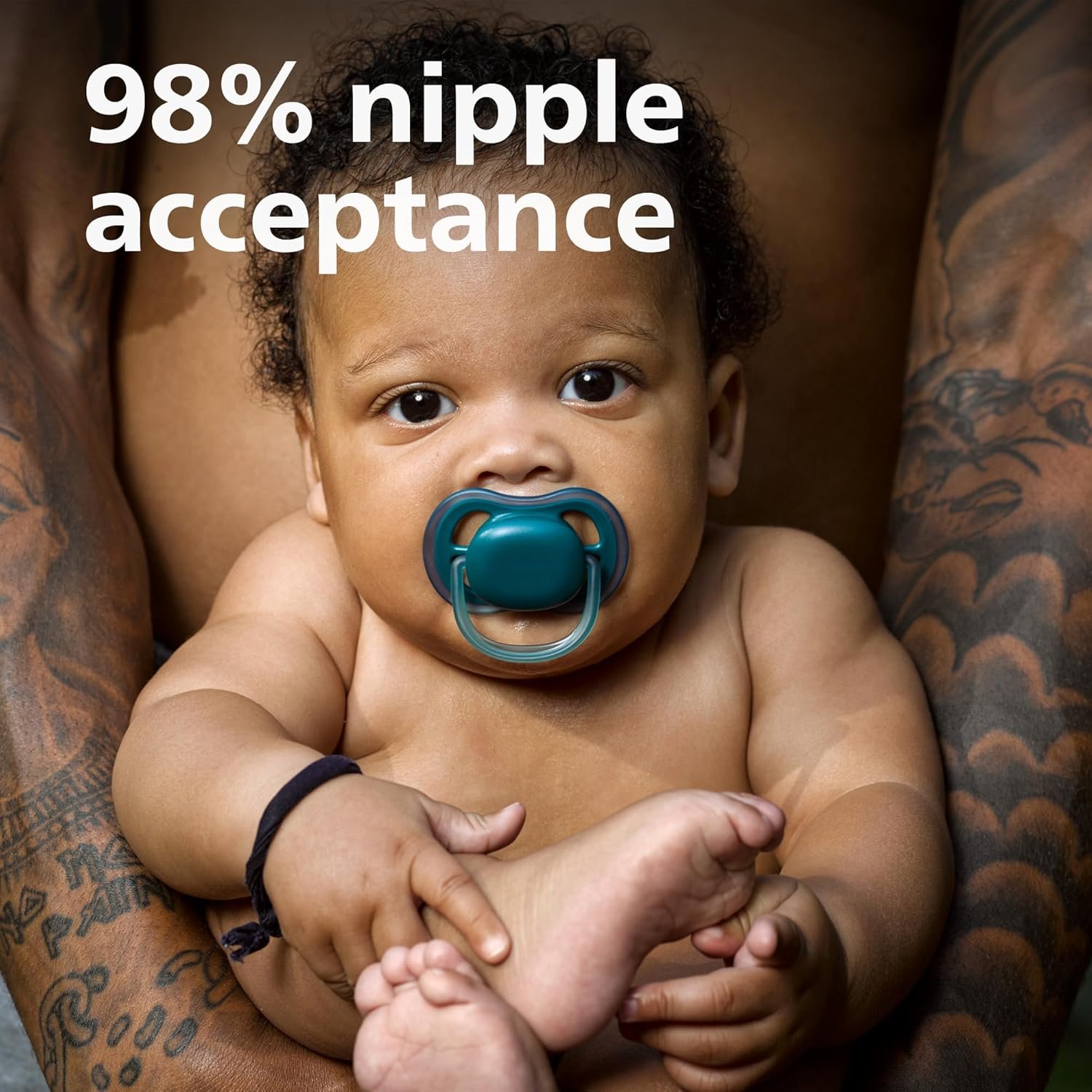 98% nipple acceptance*: When we asked moms how their little ones respond to our textured silicone nipples, on average 98%* said that their baby accepts Philips Avent Ultra Air pacifiers