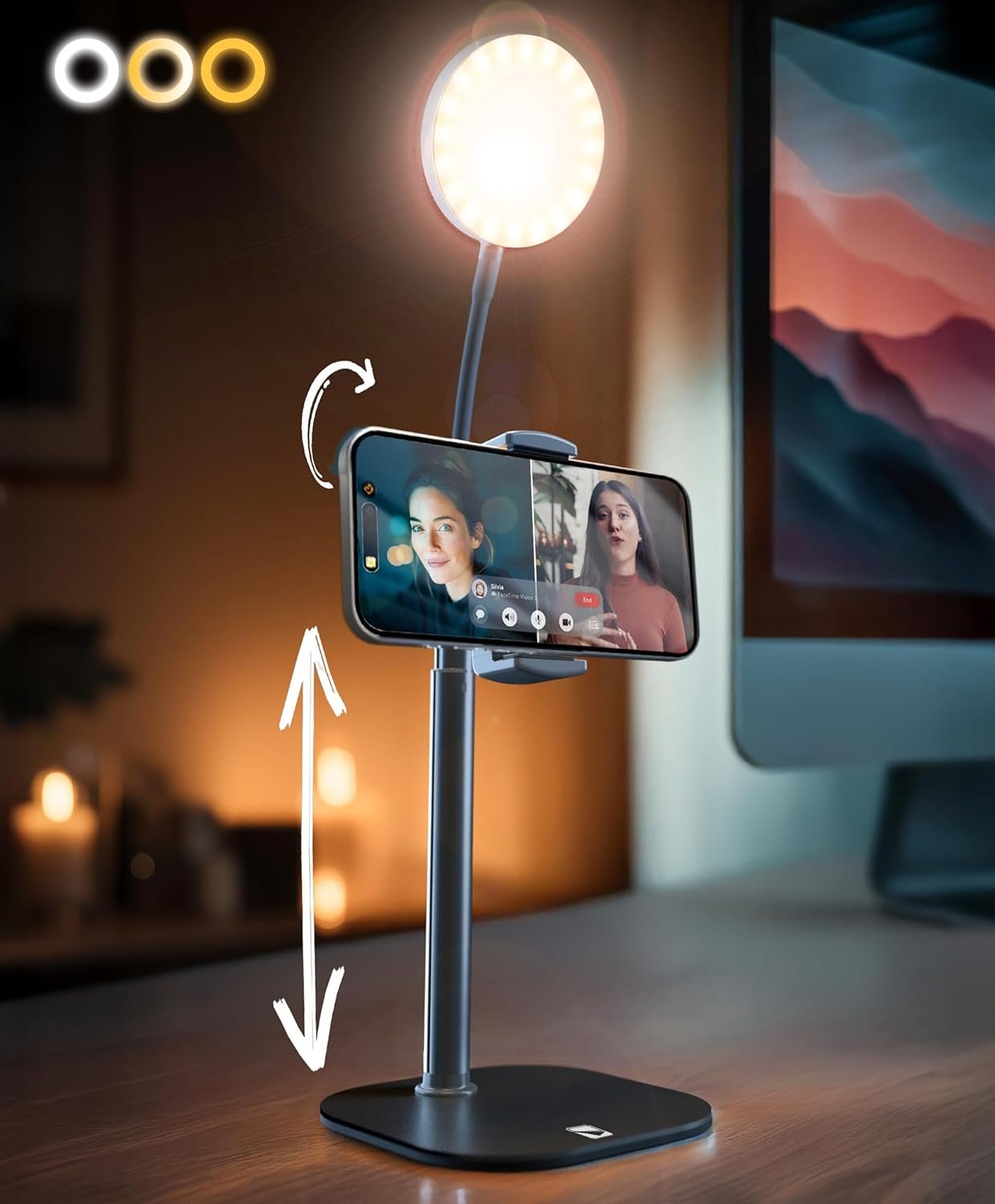 Look Professional on Every Call: Cell phone stand for desk with light for video calls; eliminates poor light with small, detachable battery-powered LED ring light on a gooseneck; desk phone stand with light that makes you look good