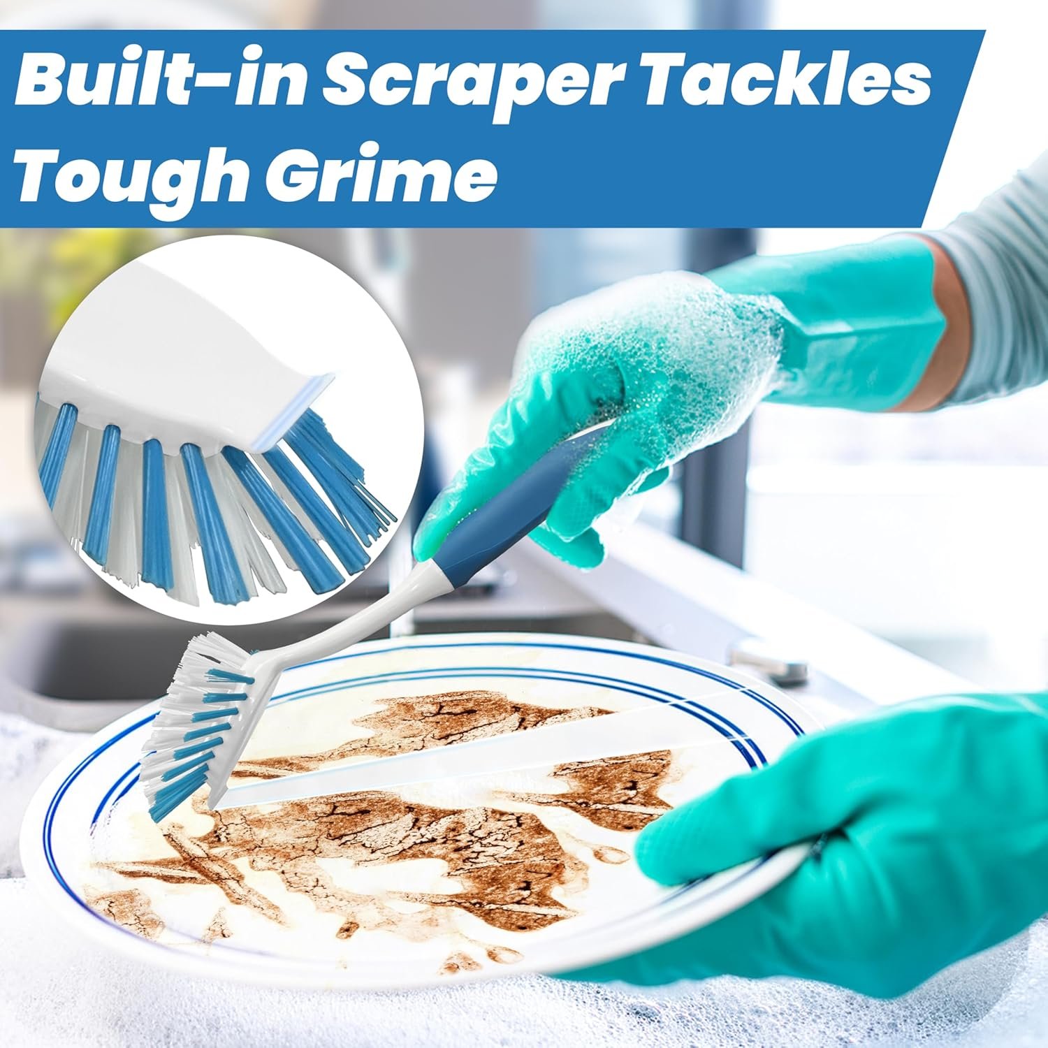 Built-in Scraper for Tough Food Residue: No more soaking or scraping with knives; The integrated scraper effortlessly lifts stuck-on grime from pots, pans, and dishes, saving you time and elbow grease