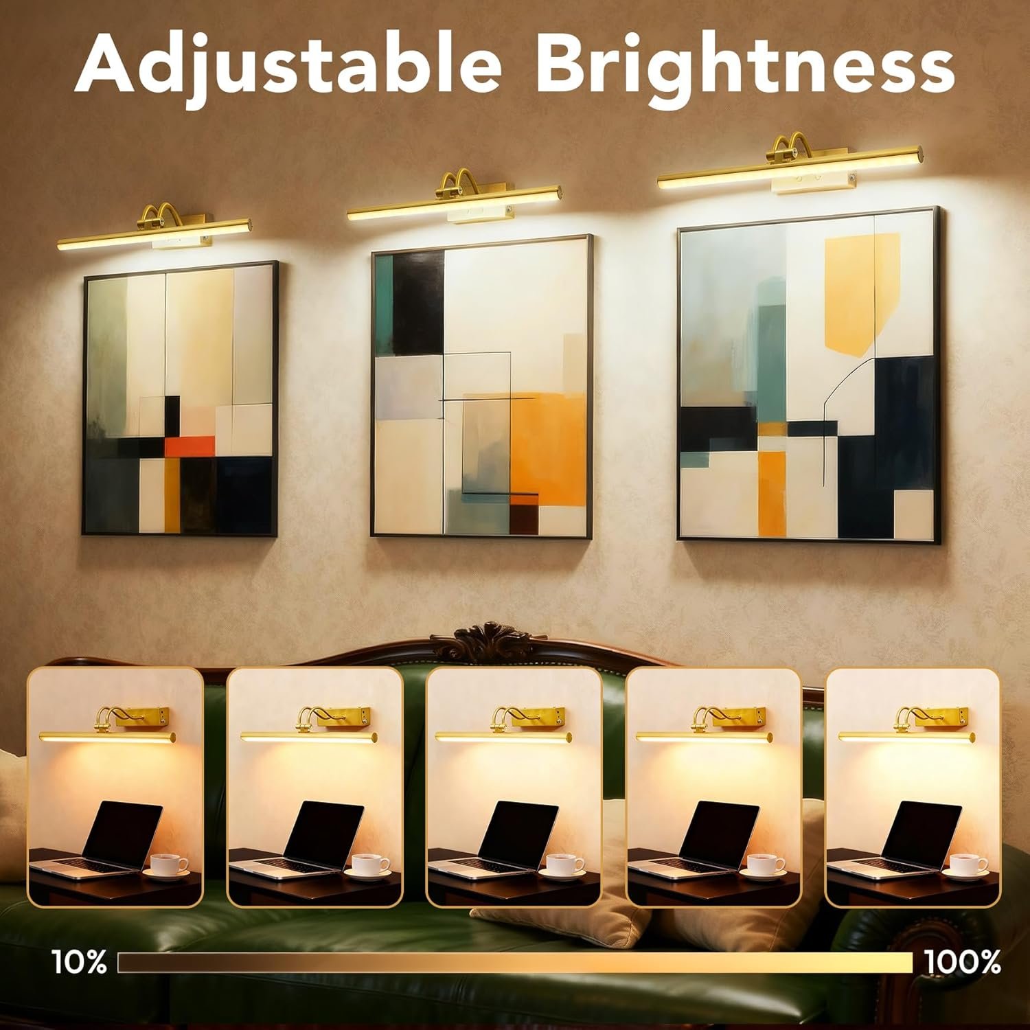 Rechargeable Picture Lights—Made of full metal picture ligts for wall, powered by 3.7V 5000 mAh lithium battery, 3-4 hours full charge can be support lighting up 10 hours(Max Brightness) and 50 Hours(Min Brightness) (USB Cable Included).