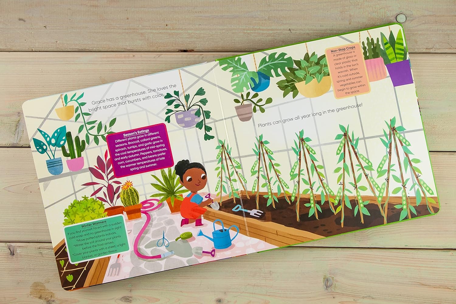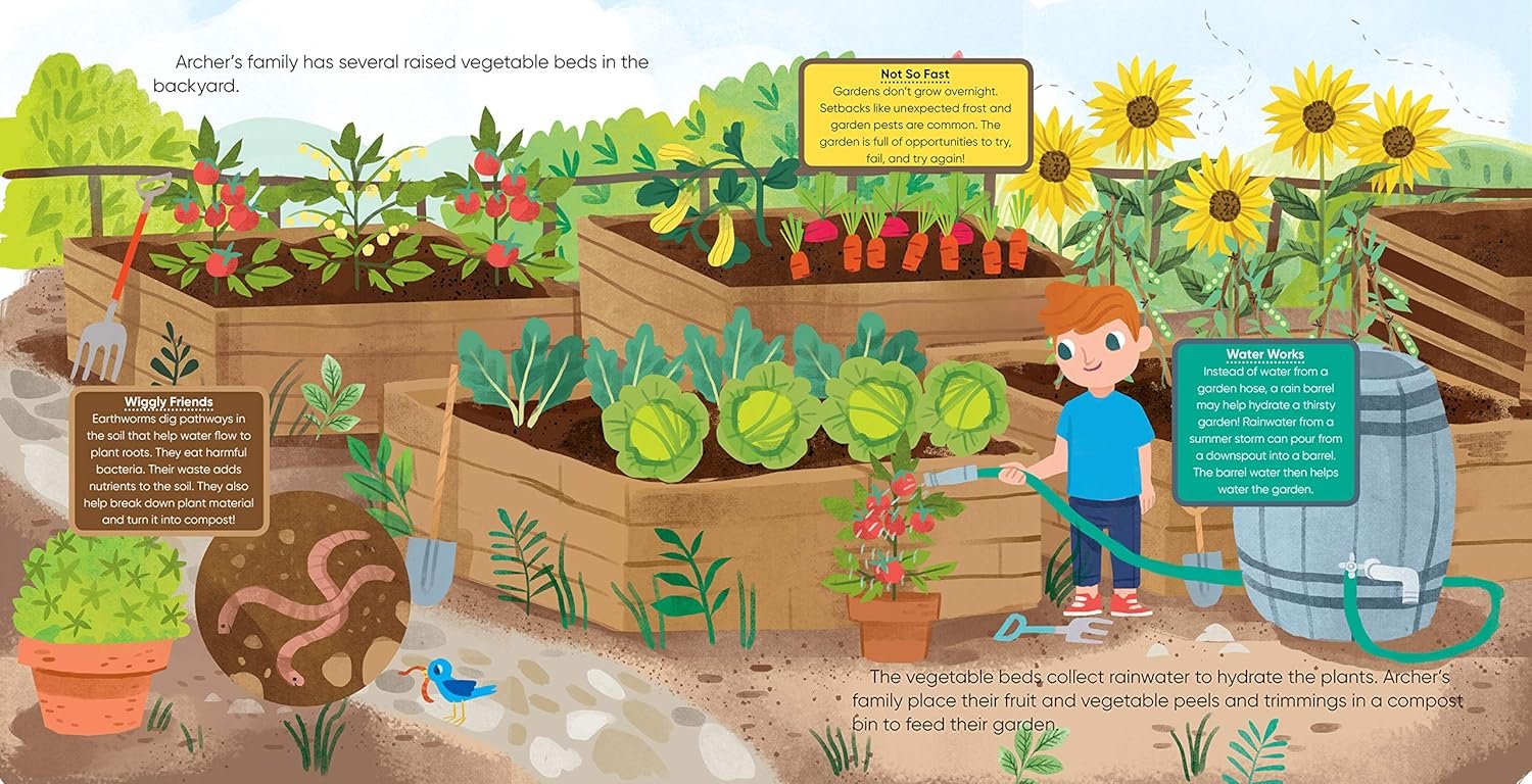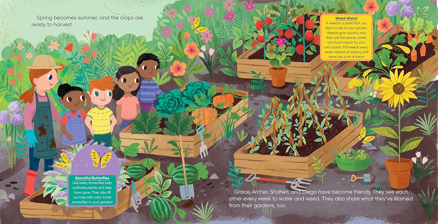 Call outs on each page help kids learn gardening facts, such as the parts of a plant, the advantage of avoiding pesticides, how butterflies contribute to gardens, and how to avoid weeds.