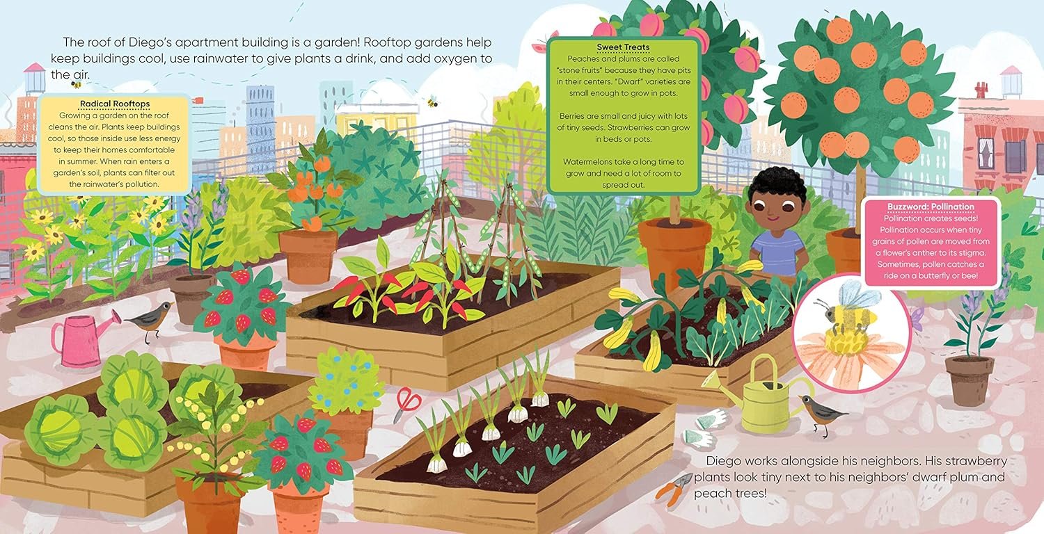 A story about a group of children who create their own gardens based on what they learned from the community garden. Beautiful illustrations, and gardening tips make understanding gardening accessible and fun!